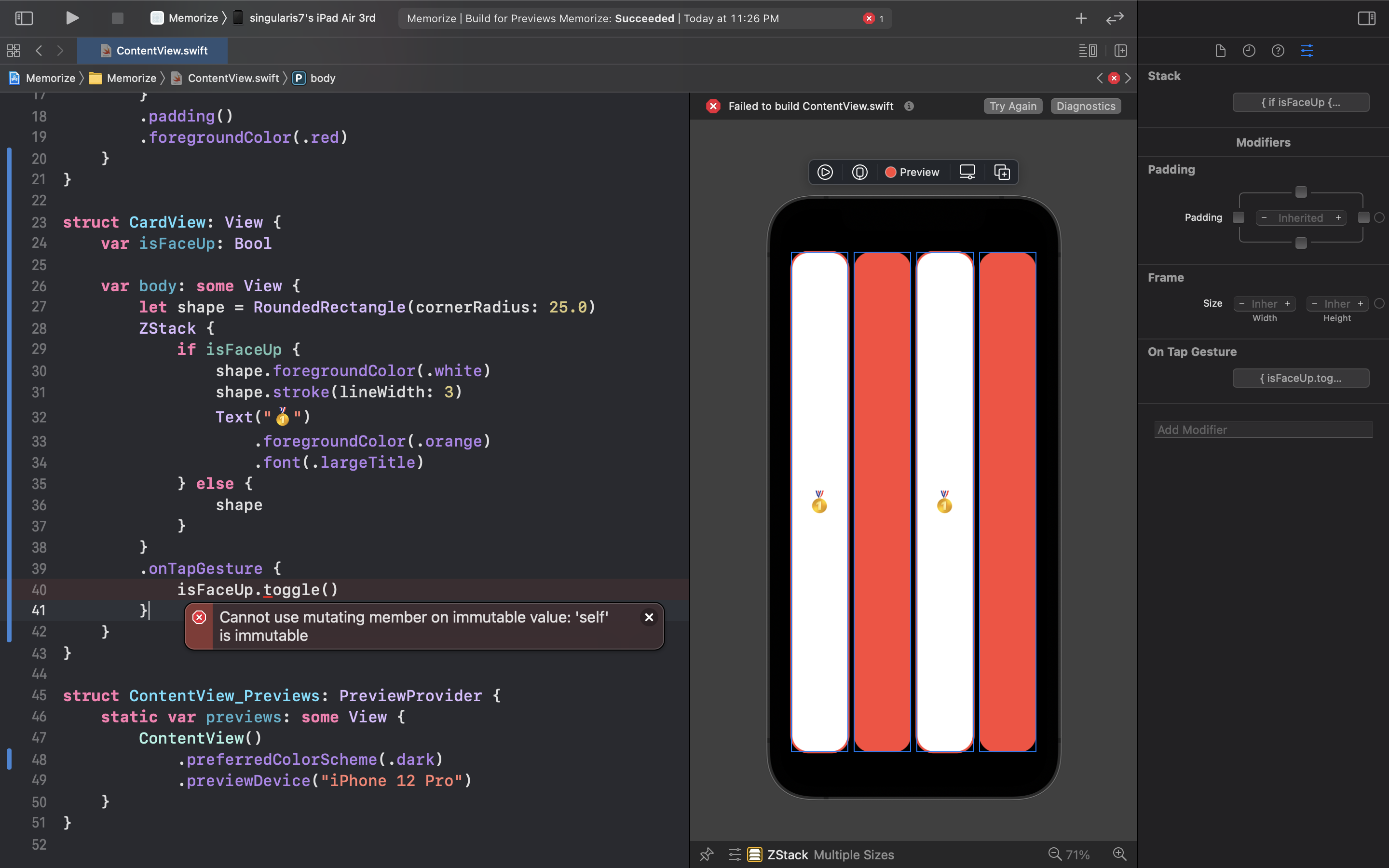 터치 이벤트가 발생할 때 마다 카드뷰 구조체가 갖고 있는 isFaceUp 변수에 있는 값을 toggle 시키도록 코드를 작성하였다. 하지만 위와같이 오류가 발생한다! 무슨 의미일까?
