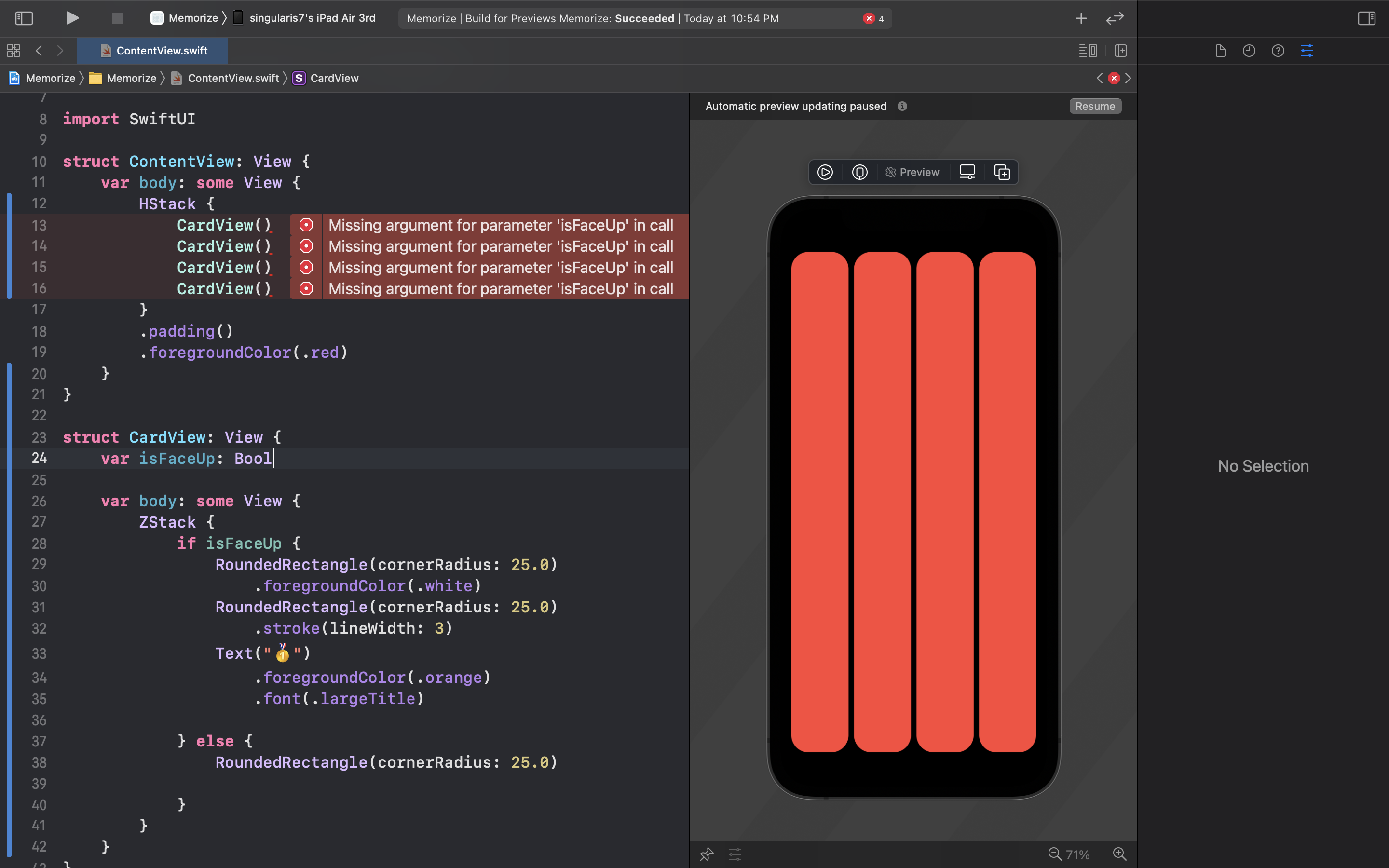 카드의 상태를 의미하는 isFaceUp 변수를 CardView 구조체에 추가해준 후 위 이미지 처럼 조건문을 추가해주면 된다. 근데 이런 방식으로 코딩하면 오류가 발생하게 되는데 이게 Swift 기본 규칙과 관련되어 있다.