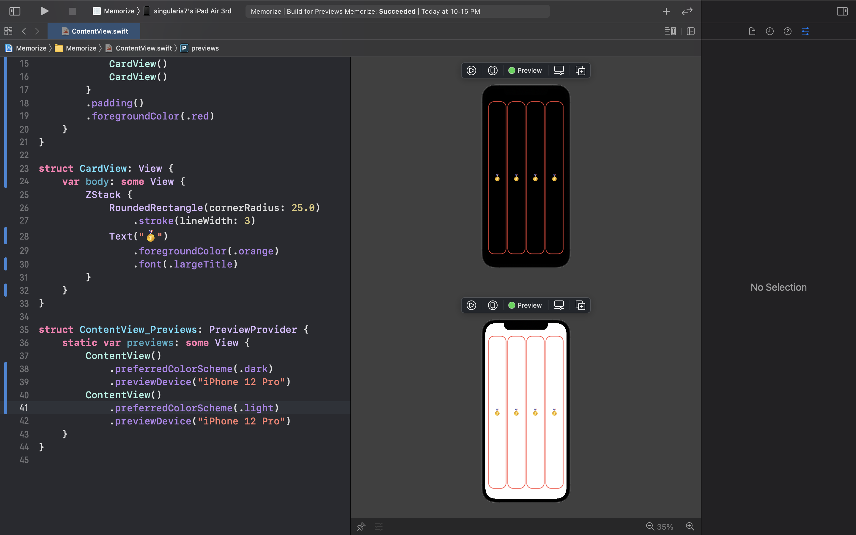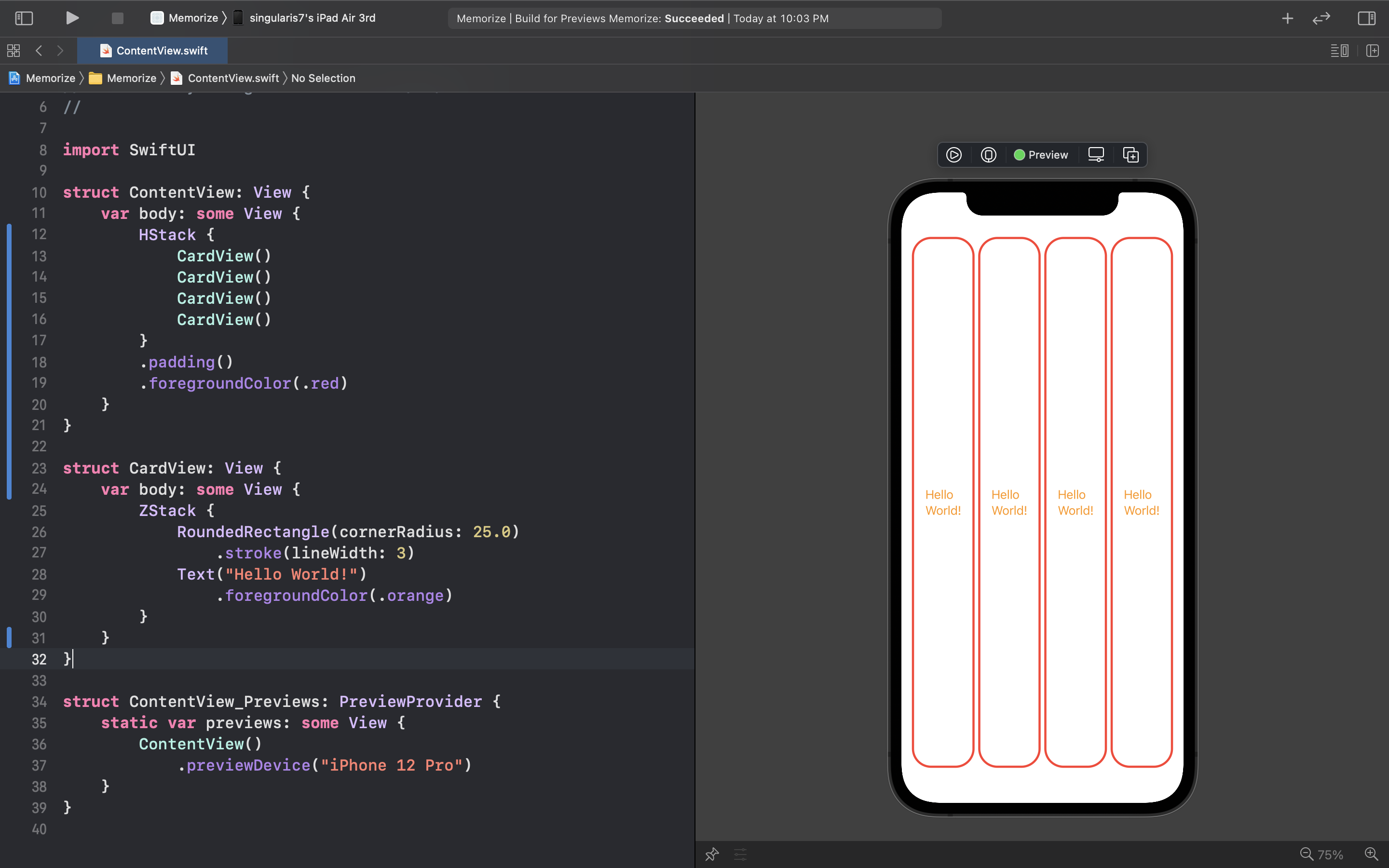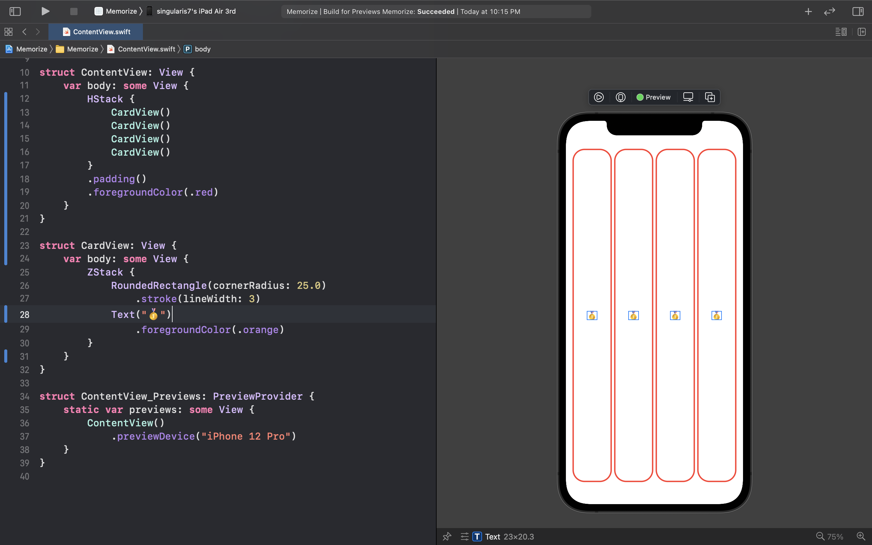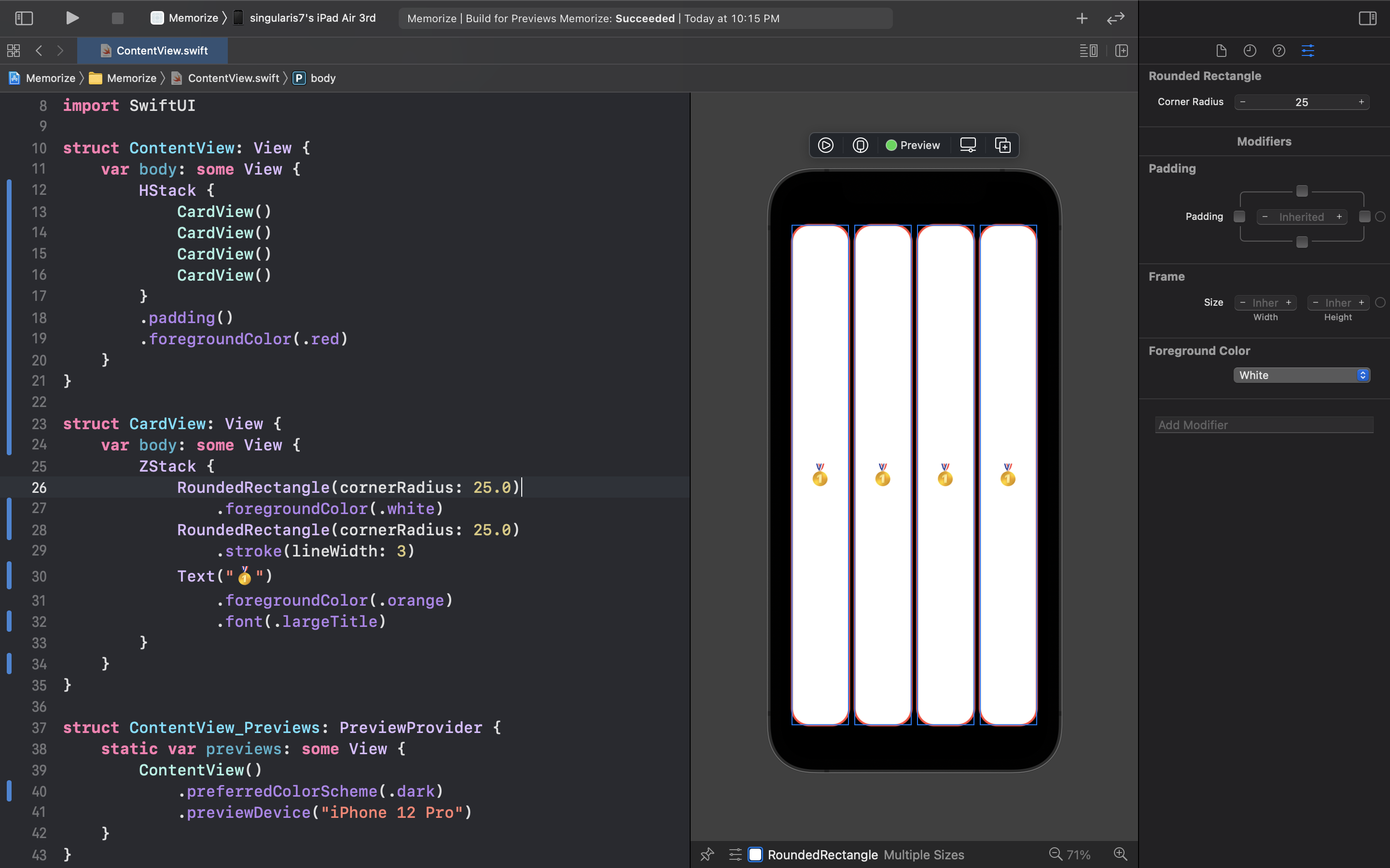 이렇게 구조체 변수에 대한 문제점은 해결된 듯 보이지만 여전히 우리의 코드는 뭔가 부족한 모습이 보인다. CardView 부분을 보면 가독성을 떨어트리고 반복되어 선언되는 문구가 존재한다 이것으로 말하자면 바로 RoundedRectangle 부분이다! 반복되는 부분을 로컬 변수로 따로 빼주면 코드를 아래와 같이 간결하게 개선시킬 수 있다.