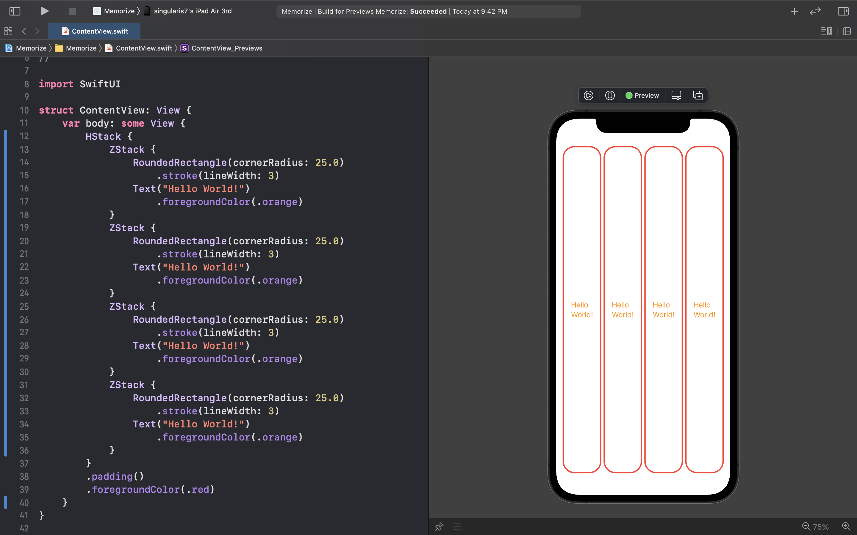 ZStack 이 UI 컴포넌트를 장치의 화면쪽에서 사용자 방향으로 쌓아가는 Combiner 였다면 HStack 은 장치의 Horizental 방향으로 UI 컴포넌트를 나열해주는 역할을 한다. 위의 예시 코드를 읽다보면 한가지 의문점이 들 수 있다!
