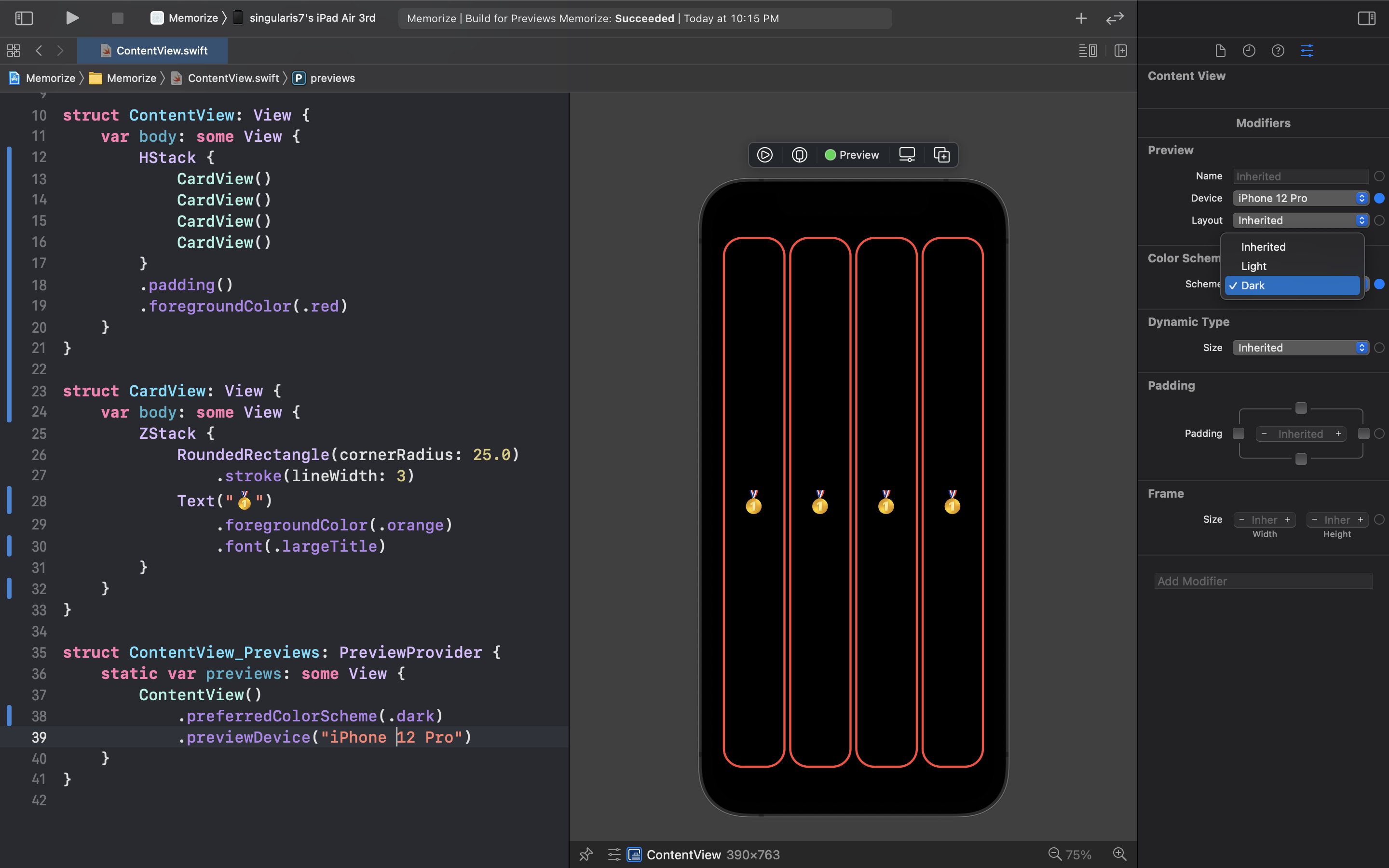 다크 모드의 설정은 우측에 보이는 Inspector 에서 Color Scheme 설정값을 Dark 로 바꿔줌으로써 설정할 수 있지만 귀찮으면 텍스트 에디터 창에 보이는 것 처럼 선호하는 컬러 스키마 옵션을 .dark 로 직접 주어도 동작한다! 좀 더 나아가서 light 와 dark 모드를 동시에 볼 수도 있는데 ContentPreview 창을 하나 더 만들어 주면 된다! (단점은 맥이 느려진다는 것 ㅠㅠ)