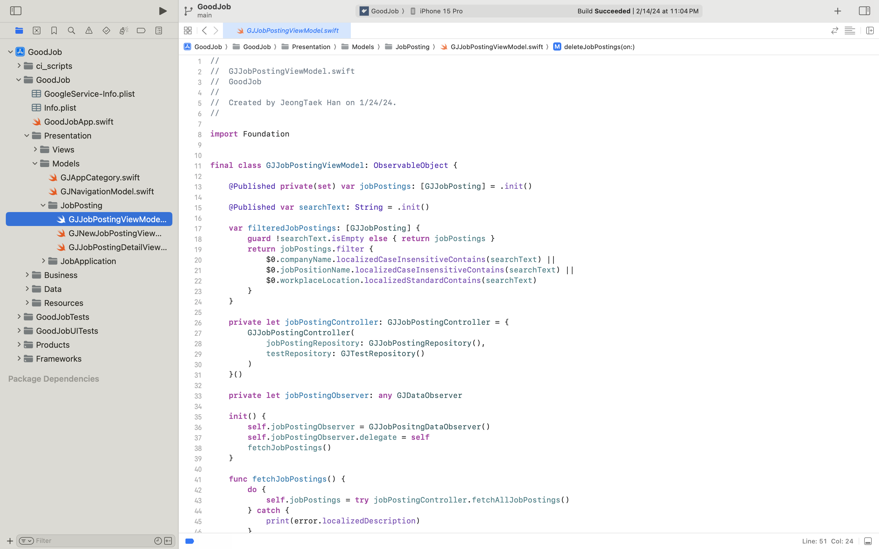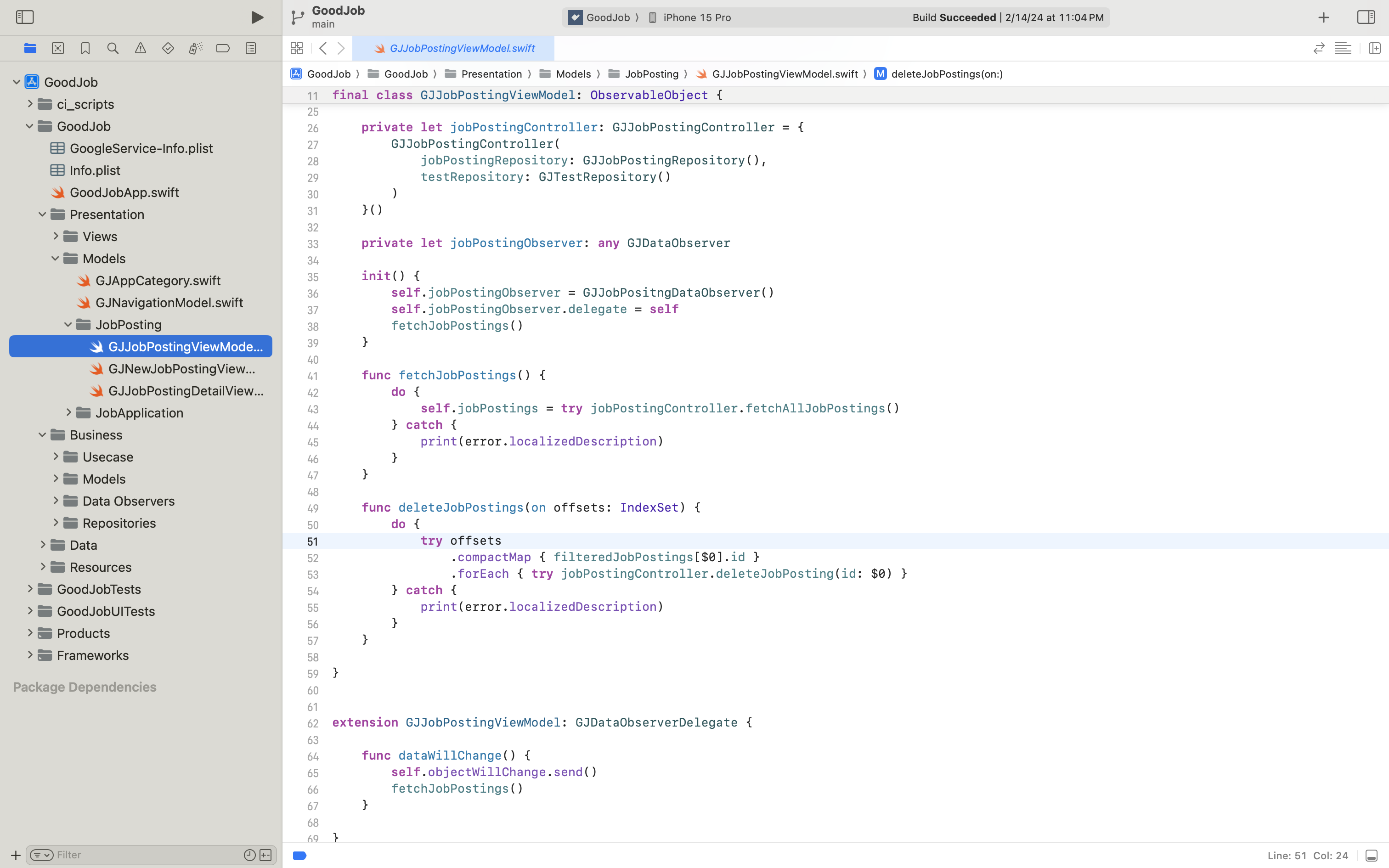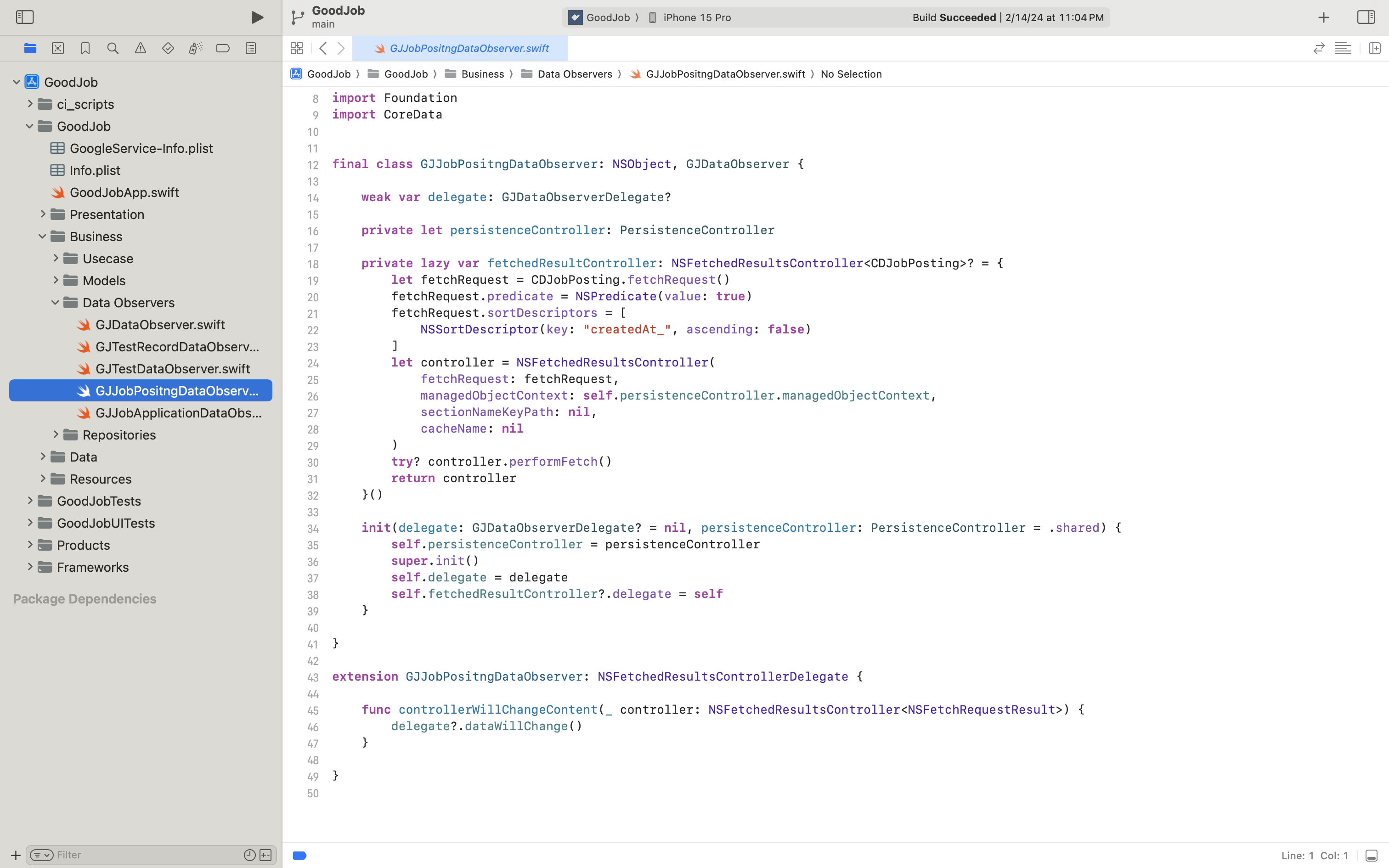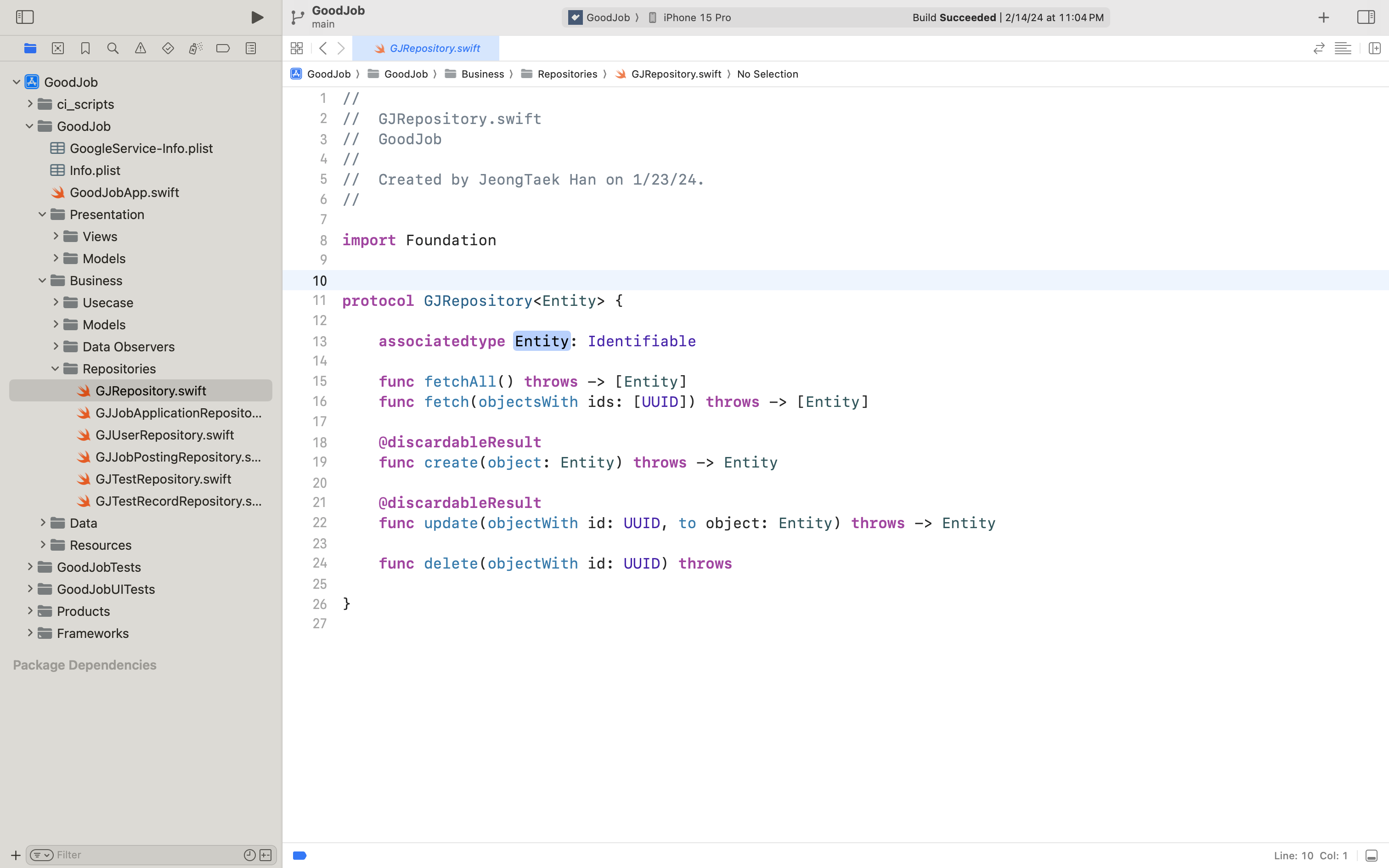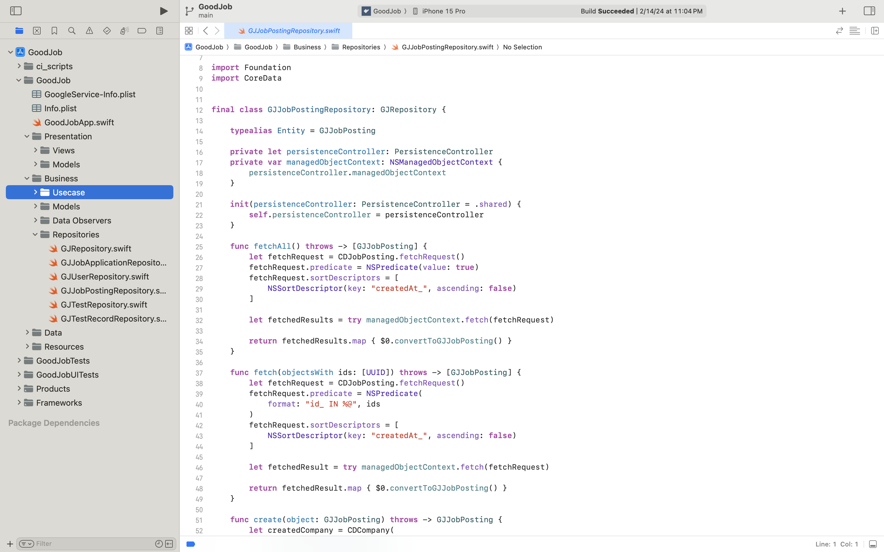 위와 같은 방식으로 Repository 내부에서는 코어 데이터 모델 엔티티 레벨의 CRUD를 제어하고 JobPostingController 등의 Interaction 영역에서는 Business 모델 엔티티 레벨의 CRUD를 제어하게 되었답니다.