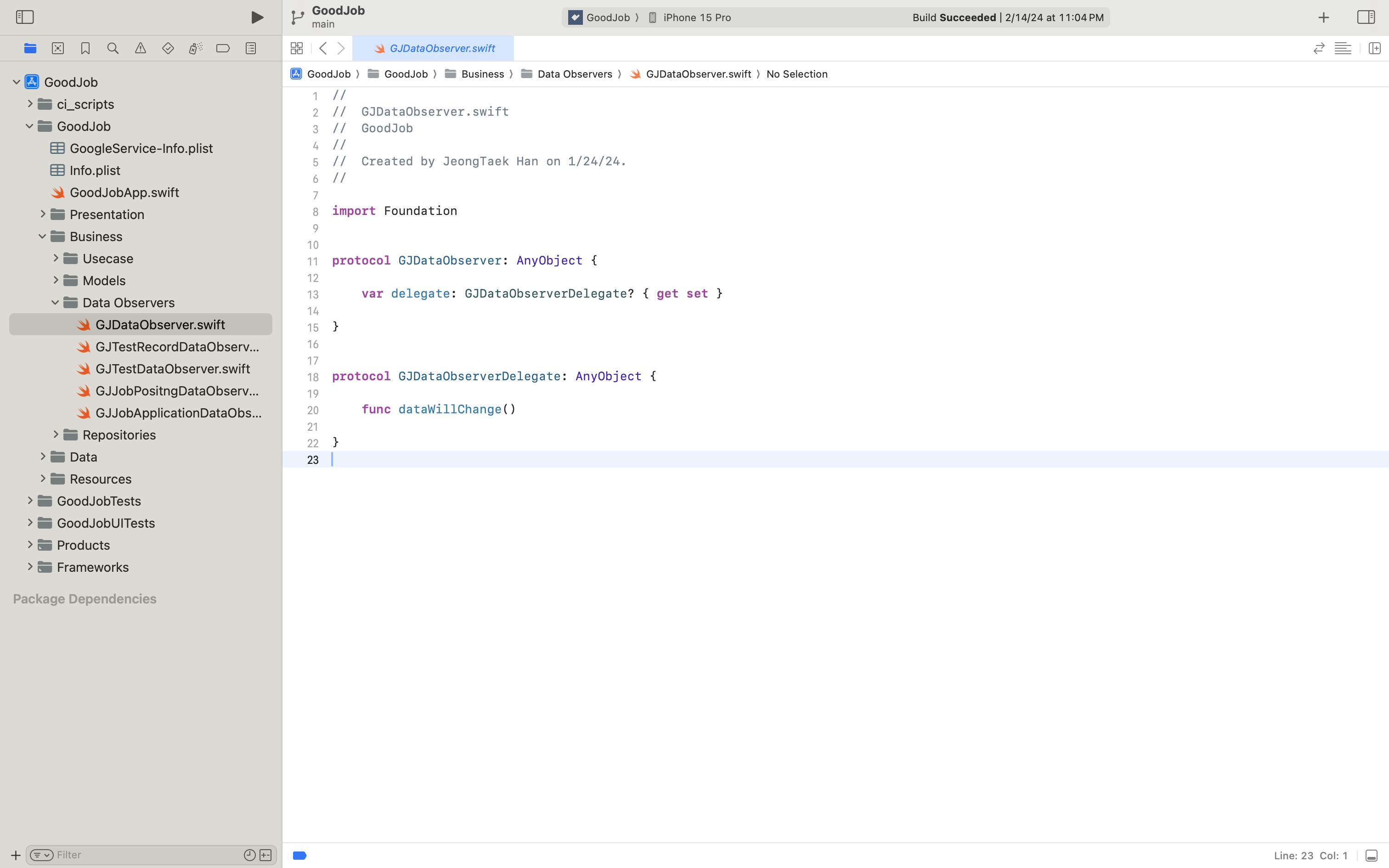 앞서 보여드렸던 설계도를 보시면 Business 로직과 Data Model의 의존성이 뒤집혀 있는 것을 확인할 수 있어요. 의존성을 뒤집는 수단으로써 프로토콜을 사용한 것이고요. 코드를 살펴보면서 어떤 부분이 어떻게 개선되었는지 몸소 느껴보기로 해요.