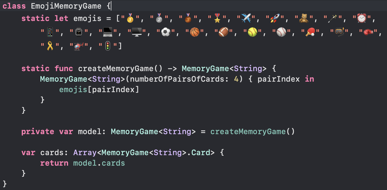 ViewModel에서 Model 의 생성자를 불러와서 초기화하고 있다. 이때 카드의 컨텐츠를 채워줄 함수는 Swift UI 에서 사용했던 방식인 인라인 함수 형태로 표현하였다. 상단에 emoji 배열이 담긴 attribute 를 보면 "static" 이라는 키워드가 사용된 것을 확인할 수 있다. static 은 대표적으로 두가지 역할을 하는데 우선 emoji 배열을 전역 변수처럼 사용할 수 있게하면서 EmojiMemoryGame 이라는 namespace에 가둠으로써 전역 변수의 문제점을 상쇄시키는 역할을 한다. 실제 사용 예시는 다음과 같다.