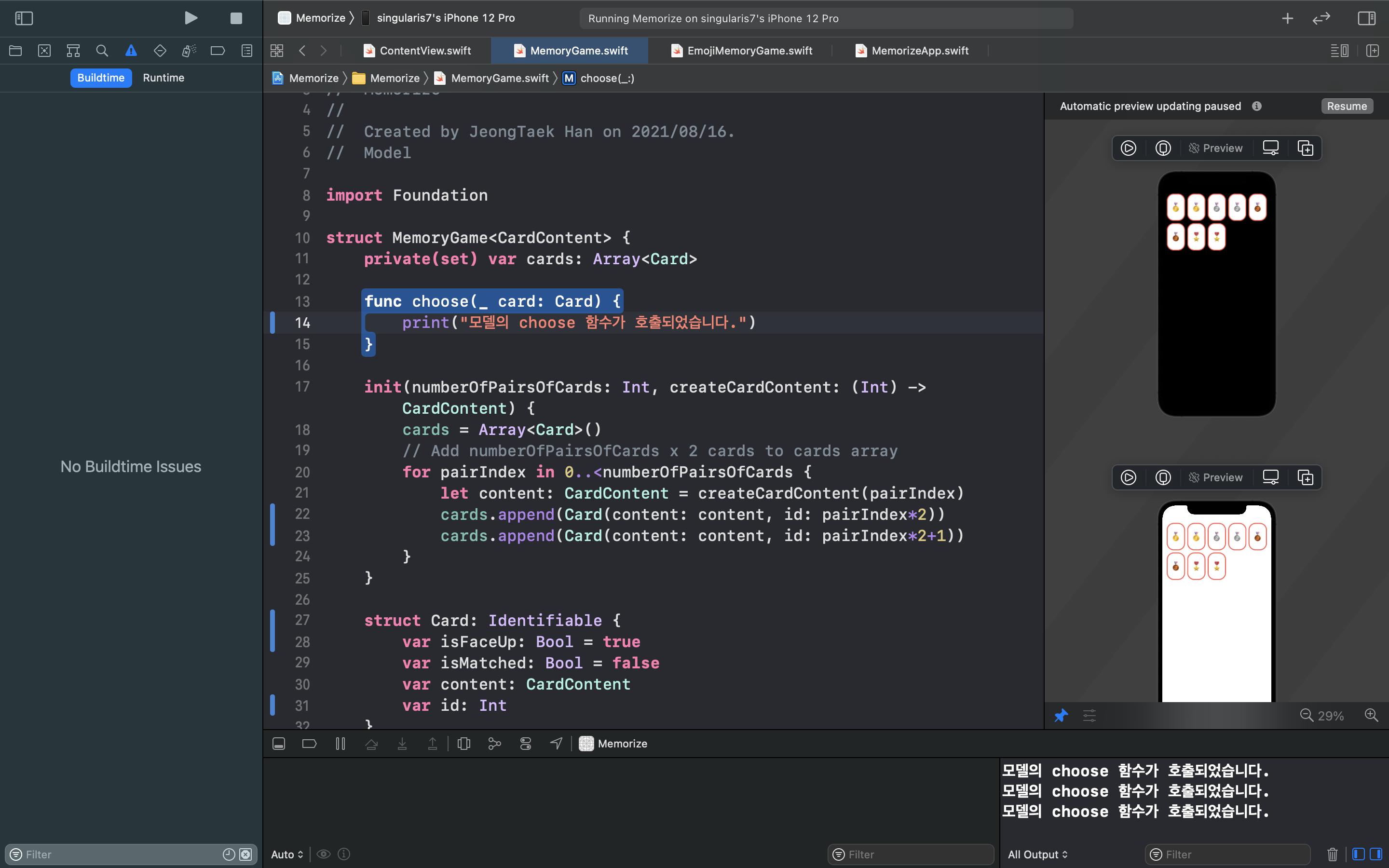 이전에 구현한 Model 과 ViewModel을 SwiftUI로 구현한 View에 연동해보는 시간을 가질 것입니다. View 구현에서 카드를 불러오거나, 뒤집는 등의 Model이나 View Model을 통해 이루어져야 하는 코드를 지워줍니다.