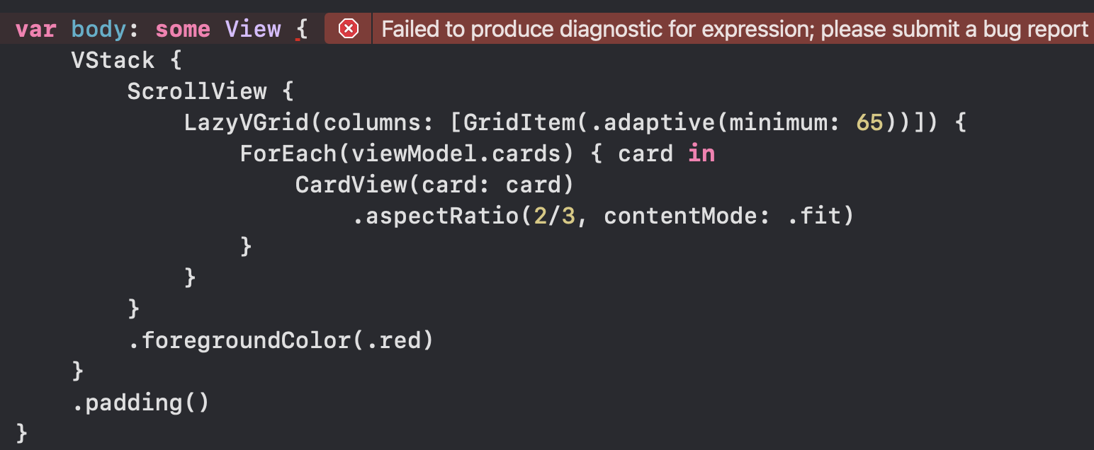 이제 조금 진행되려나 했는데 문제가 발생했다. 우리가 만든 card는 identifiable하지 않기 때문에 ForEach가 동작하지 않게 된다. 이전에 string 은 id 파라미터에 string self 값을 넘겨주어 "동작" 하게는 만들었는데 이번에도 특정 개체를 식별할 수 있는 hashable 한 요소가 필요할 것이다. 이 사실을 모른체 좀더 꼬이다 보면 위와 같이 컴파일러가 문제를 찾아주지 못하는 경우가 발생될 수 있기도 하니 조심하자!