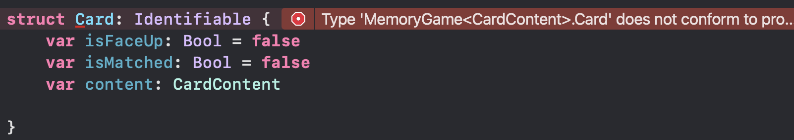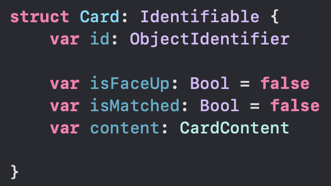이번의 경우 카드마다 일련번호를 매겨보는 것을 상상하면서 id 프로퍼티의 타입으로 Int를 사용할 것이다. 또한 카드를 배열에 넣을 때 pairIndex를 활용하여 각 카드에 대한 일련번호를 지정해줄 것이다.