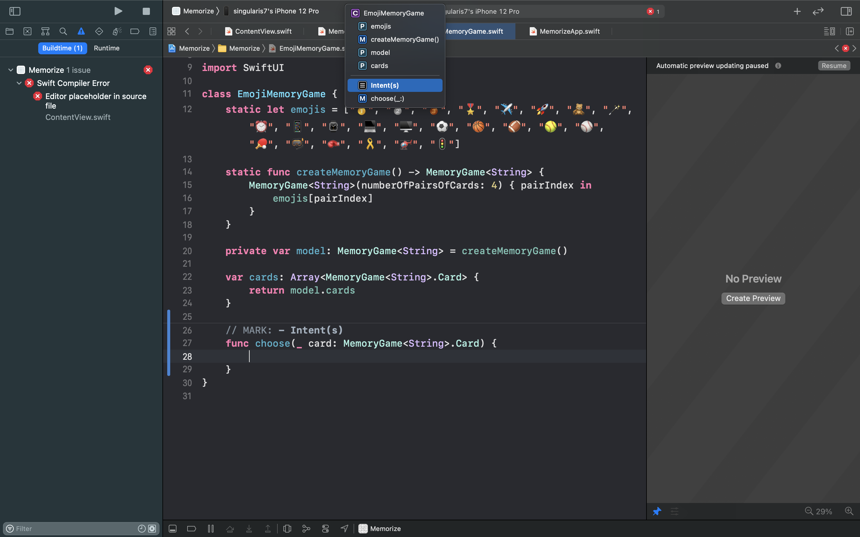 일종의 Tip 으로 "MARK" 키워드를 사용하면 상단에 보이는 것처럼 손쉽게 바로가기 기능을 사용할 수 있다. 이제 onTabGesture 의 내부 코드로 방금 정의한 intent 함수를 불러오고 카드를 뒤집고자 하는 사용자의 의도를 처리할 수 있도록 함수를 실제 구현해보자!