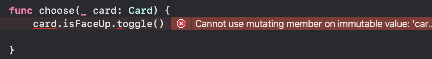 라고 생각했는데 오류가 발생했다! 대충 내용이 card는 immutable 한 친구라고 설명하고 있다. 왜 일까? 사실 함수의 인자로 넘어온 card가 수정될 수 없는 것은 당연한 일이다. card는 구조체로 정의되어있으며 다른 어딘가로 할당하면 값복사가 발생하여 원본과 다른 인스턴스가 되어버리기 때문이다.