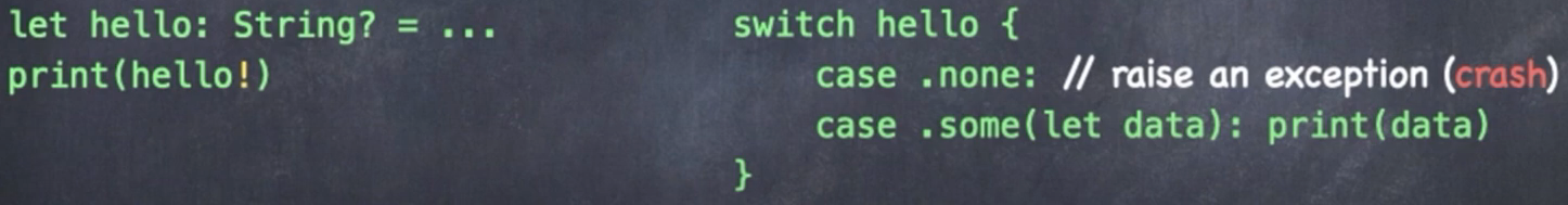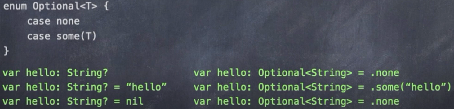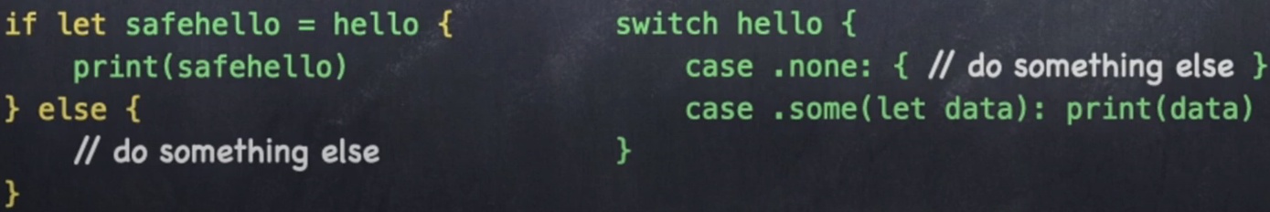 옵셔널을 사용하는 방법이다. 처음에 선언한 hello는 String으로 정의된 옵셔널 타입이며, 값이 들어있지 않은 case 인 .none 상태에 있다. 두번째 hello 또한 마찬가지로 String으로 정의된 옵셔널 타입이며, 값이 들어있는 case 인 .some에 연관되어있는 데이터로 string 타입의 hello가 담겨 있다. 마지막은 다시 옵셔널의 값이 없는 상태로 설정하는 코드이다. nil 키워드가 사용되어있다!