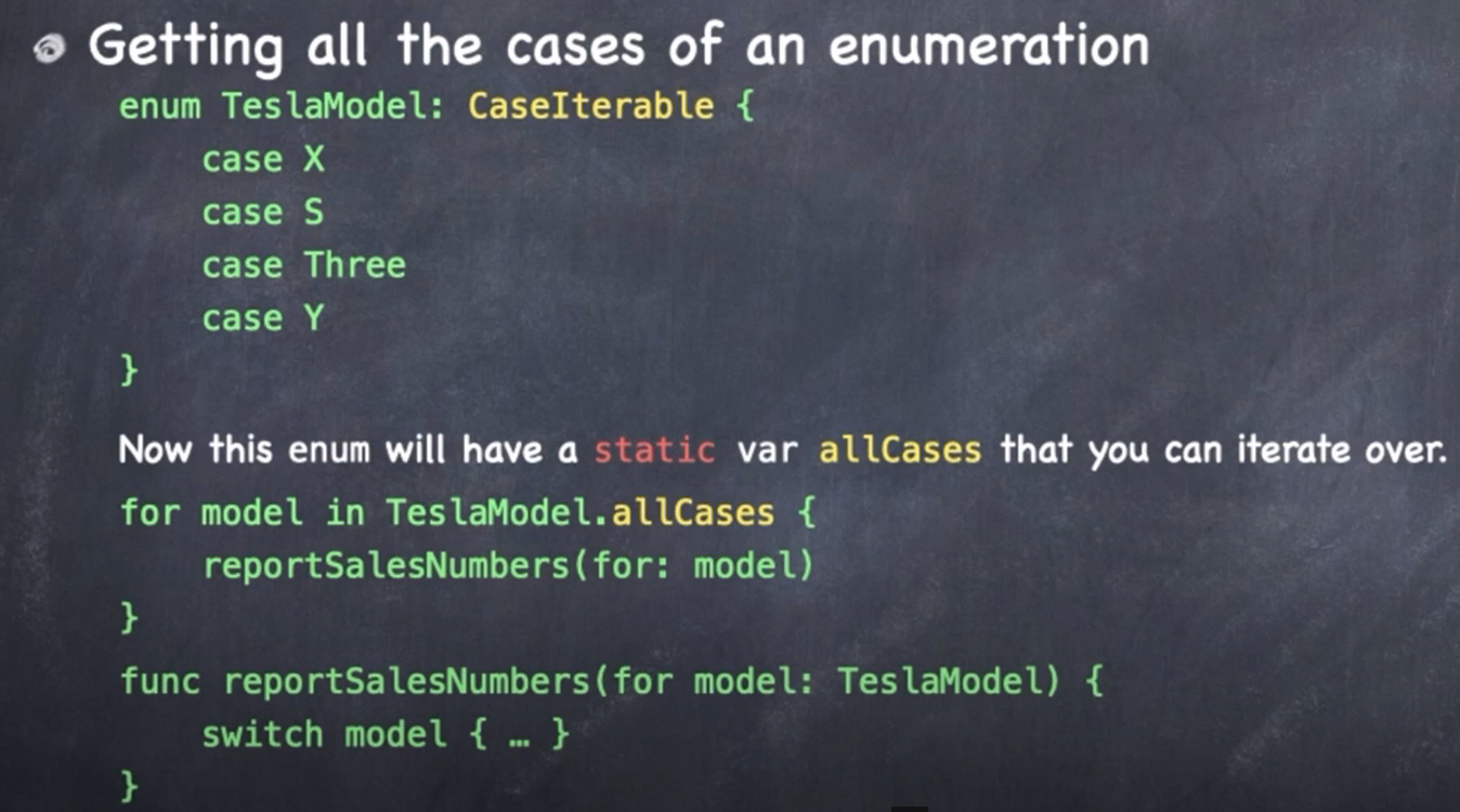 때때로 enum 이 가진 여러 case 들을 열거해보고 싶을 수 있다. 이 때 enum에 CaseIterable 프로토콜을 붙여주면 enum에 정의된 모든 케이스에 대하여 반복문을 사용할 수 있게되며 출력하건 활용하건 나머지는 프로그래머의 마음이다 ㅎㅎ