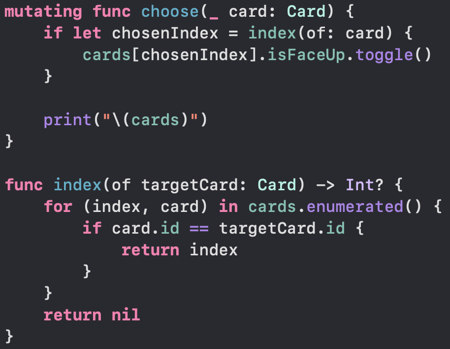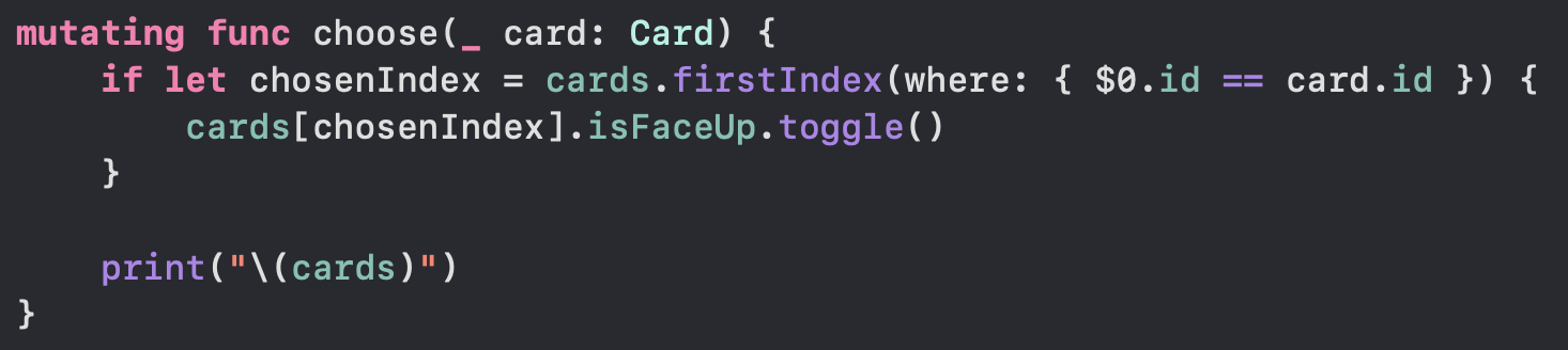 이제 카드를 뒤집는 로직이 완성되었지만 아직 목표가 달성된 것이 아니다. 우리는 Memorize 게임을 만드는 것이 목표이기 때문이다. 규칙을 생각해보자. 먼저 카드를 하나 뒤집고 다른 카드를 뒤집는다. 두 카드의 내용이 같다면 잘 뒤집은 것이고 다르다면 잘못 뒤집은 것이다. 잘 뒤집었다면 두개의 카드의 isMatched 값은 true가 되어야 하며 잘못 뒤집은 경우 다시 카드의 뒷면이 보이도록 뒤집어두어야 한다.