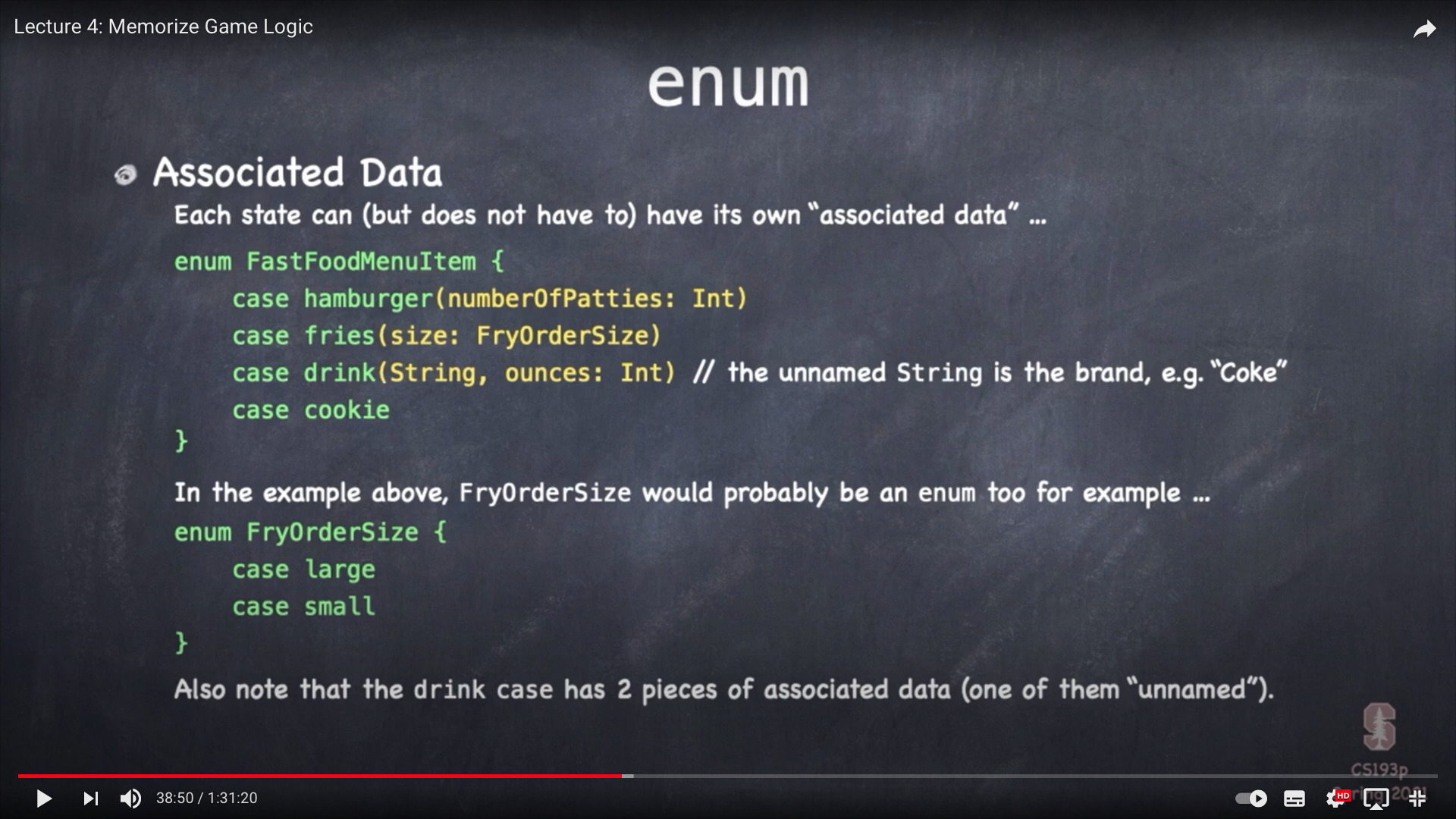 Swift에서 Enum의 대표적인 특징은 각 상태에 대하여 관련 데이터를 가질 수 있다는 점이다. (공식 문서에는 바코드를 예시로 설명하고 있다) 위의 예시에서 햄버거의 패티 개수를 담거나 주문순서 등을 각 유형에 데이터로 담고 있다. 사용하는 방법은 다음과 같다