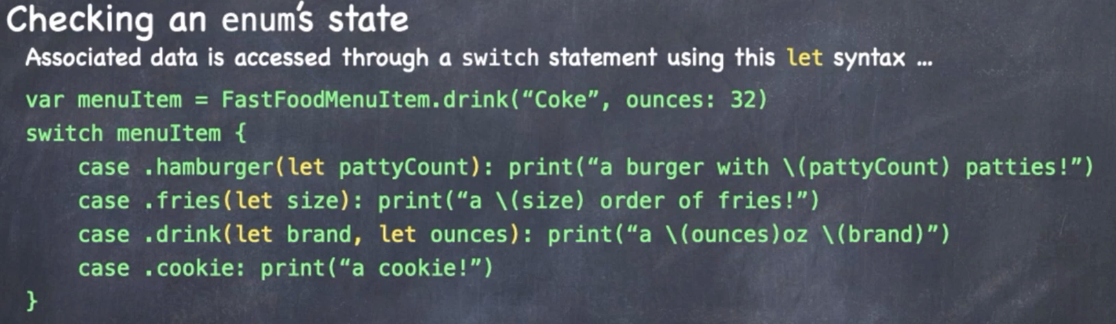 let menuItem: FastFoodMenuItem = FastFoodMenuItem.hamburger(patties: 2)