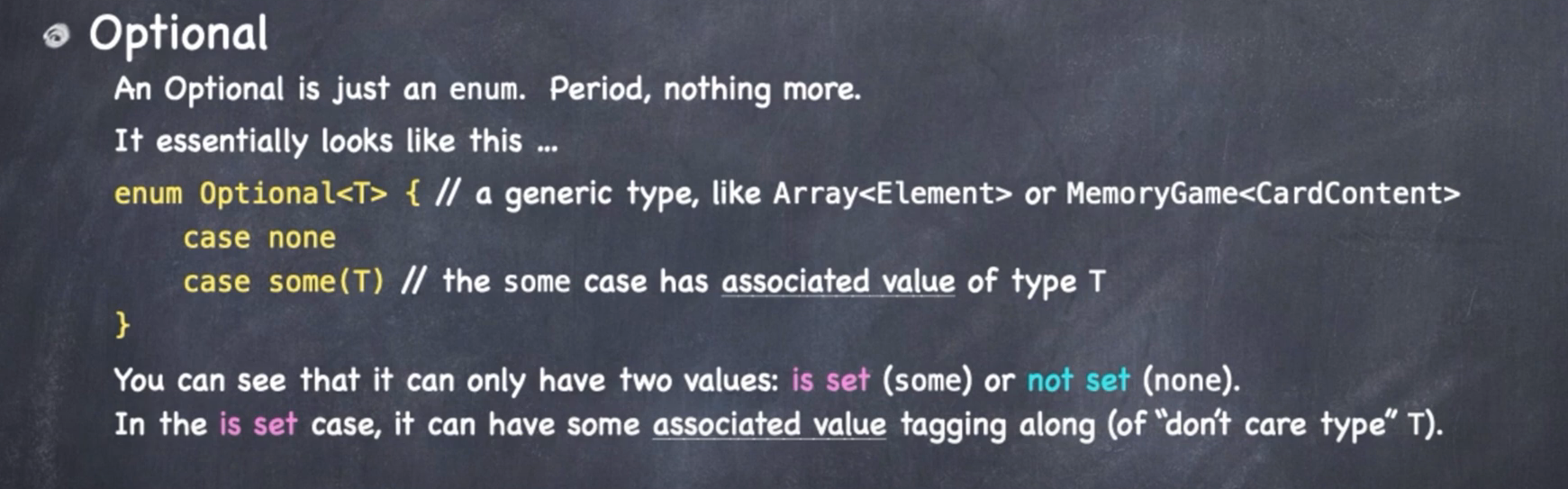 An extremely important type in Swift. 스위프트에서 사용되는 가장 중요한 열거형 타입은 바로 Optional 이다. 다른 컴퓨터 언어를 배울 때 많이 보이지 않아서 어려웠던 개념의 시작은 enum 이었으며 값이 들어 있는 case 와 값이 들어있지 않은 case 로 구분되어있다. 옵셔널에도 여러가지 타입의 값이 담길 수 있어야 하므로 Dont' care 타입인 제네릭을 활용하여 정의되어있다.