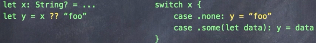재미있는 구문도 몇가지 있다. 위와 같은 "??"(nil-coalescing operator)를 사용하면 ?? 왼쪽에 있는 옵셔널 x에 값이 들어있을때 x 의 내용을 y에 담고 x가 nil이면 ?? 우측의 "foo" 를 담도록 처리한다. 마치 삼항연산자와 매우 닮아 있는 느낌이 든다.