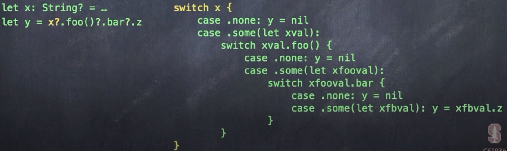 옵셔널로 정의된 무언가에 접근할 때 옵셔널 체이닝을 활용할 수 있다. 위 코드의 경우 x, foo(), bar 모두 옵셔널 값으로 이루어져 있는데 중간에 어느 누구도 nil이 아니라면 y에는 z값이 정상적으로 담기지만 중간에 어느 하나라도 nil이라면 y에도 nil 값이 담기게 된다.
