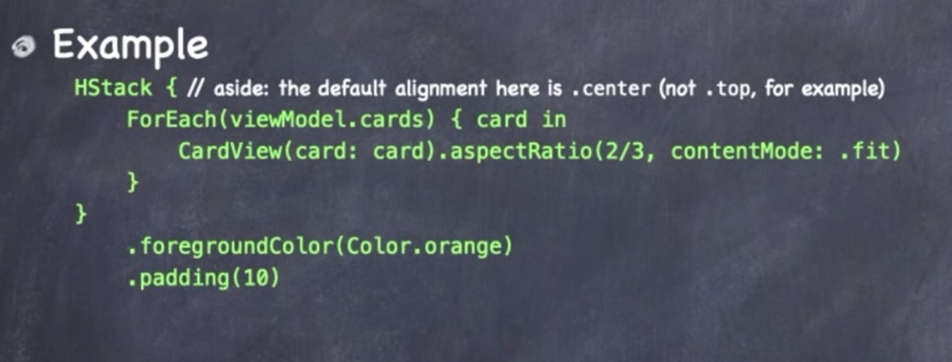 위 코드를 해석해보자! 초록색으로 칠해진 가장 바깥쪽 컨테이너인 HStack에 padding(10)으로 수정되었기 때문에 바깥쪽 컨테이너에서 10만큼을 제외한 나머지 공간을 내부에 있는 View들이 사용할 수 있다. 또한 내부의 View들에 대하여 foregroundcolor를 제공한다. 이 친구는 공간, 레이아웃을 수정하지 않기 때문에 HStack에 제공된 공간과 동일한 공간을 제공하게 된다. HStack은 내부의 카드뷰에 대하여 aspectratio를 통과한 view에 대하여 모두에게 균등하게 공간을 할당시켜준다. 이 때 HStack이 각 카드에 할당해준 너비가 있을텐데 이 너비를 기준으로 aspect ratio 를 맞추어 결과물을 출력하게된다. 혹은 반대로 주어진 공간에 높이를 최대한 맞춘 뒤에 폭을 비율에 맞춰 골라오는 방법도 있다. 이러한 방식으로 view가 배치되니 알아두어야 할 것 같다.