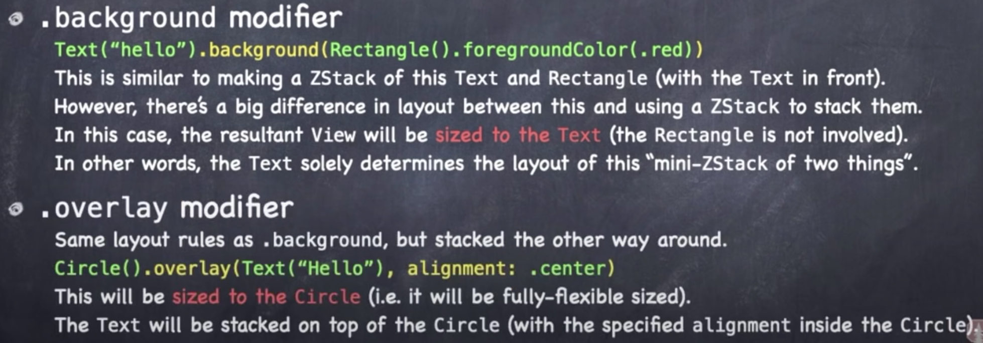 .overlay modifier도 사용해볼 수 있을 것이다. background modifier과 같은 규칙이 적용되지만 주체 View의 뒷쪽이 아닌 앞쪽으로 쌓인다는 특징이 있다. 언급된 두개의 modifier는 container 처럼 동작하며 작은 단위의 ZStack을 만들때 자주 사용된다고 하니 기억해두자!