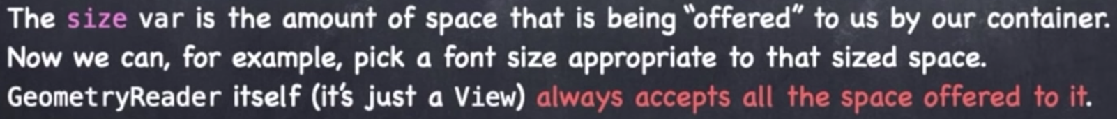 geometry 파라미터는 GeometryProxy이며 GeometryProxy는 작은 구조체로 정의되어있다. 그중 눈에 띄는 것은 var size 이다. size 변수는 컨테이너에 의해 우리에게 제공되는 공간의 양이다. 이제 내부에 view는 자신에게 주어진 공간의 크기를 알고 있으니 이에 맞추어 자신의 크기를 조정할 수 있을 것이다.