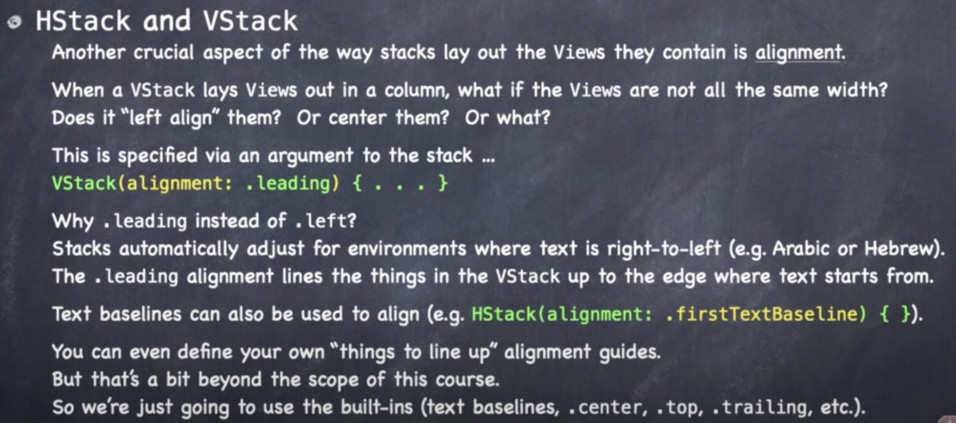 alignment를 지정해주지 않으면 center 정렬을 기본값으로 갖는다. 다른 종류도 선택할 수 있는데 가장 흥미로운 것은 ".leading"과 ".trailing"이다. 왜 .left 혹은 .right가 아닌 이런 선택지가 존재하는가? 왜냐하면 Stack은 사용자의 언어 환경에 맞추어 View를 정렬하기 때문이다! (상상하지 못한 일이다!!)