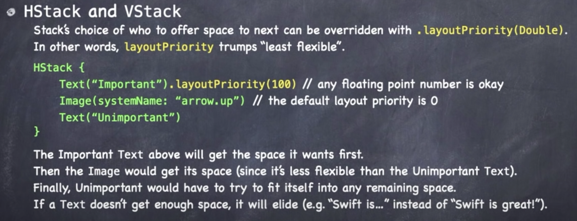 앞서 소개했듯이 일반적으로 VStack과 HStack을 사용할 때에는 Least Flexible한 View를 우선으로 공간 할당을 진행한다고 했는데, layoutPriority 메서드를 활용하여 우선순위를 수동으로 조절할 수 있다. 파라미터로 아무것도 지정하지 않으면 0이 기본값이며 부동소수점도 인자로 넣을 수 있다.