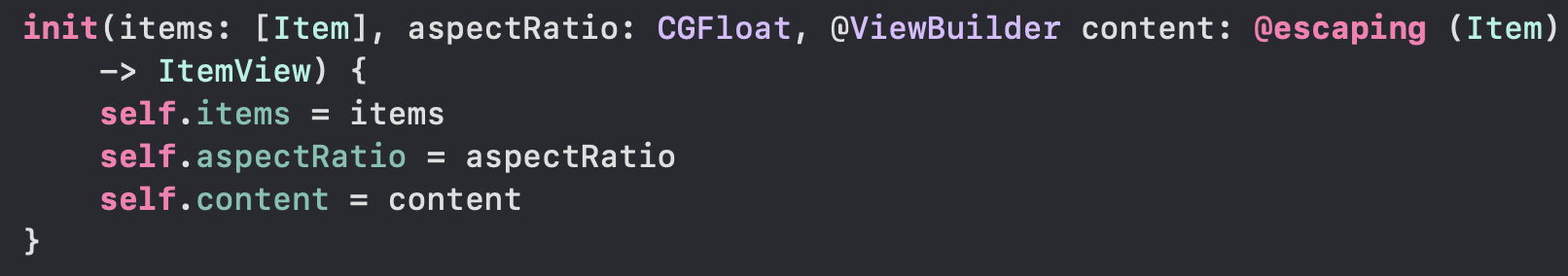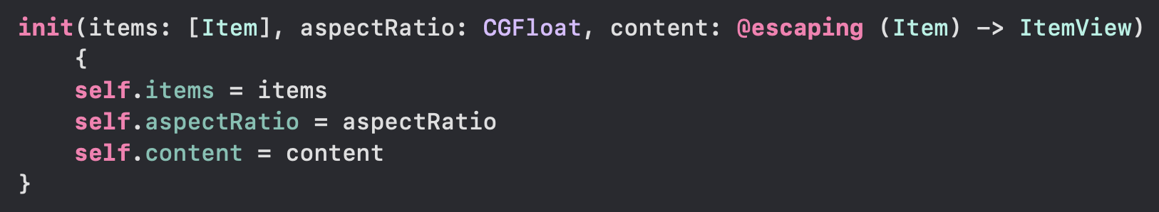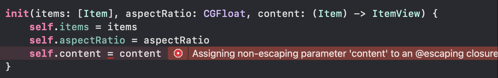 이 문제를 해결하기위해 AspectVGrid 구조체에 생성자를 정의해보았다. 파라미터로는 AspectVGrid가 갖고 있는 프로퍼티를 설정할 수 있도록 작성되었다. content 클로져를 받는 부분에서 "escaping 클로져를 넣어줘야 할 곳에 non-escaping 클로져를 넣어주고 있어!"라고 오류를 내보이고 있다! 이게 무슨 의미일까?