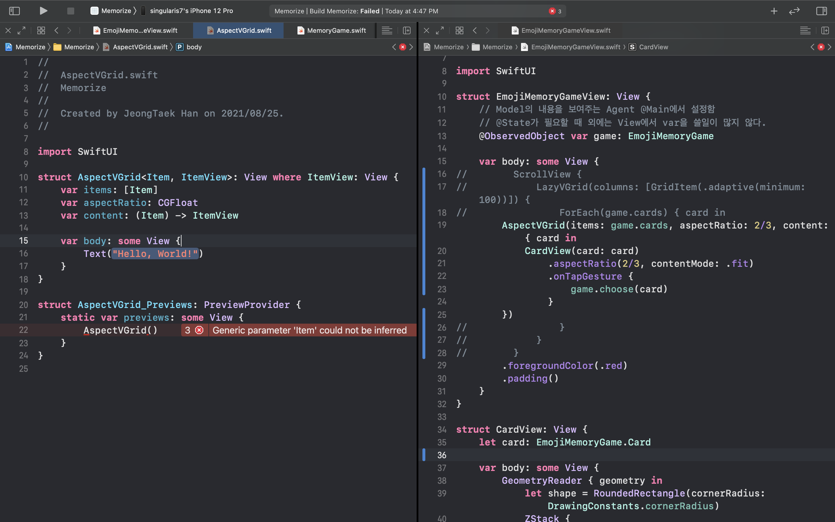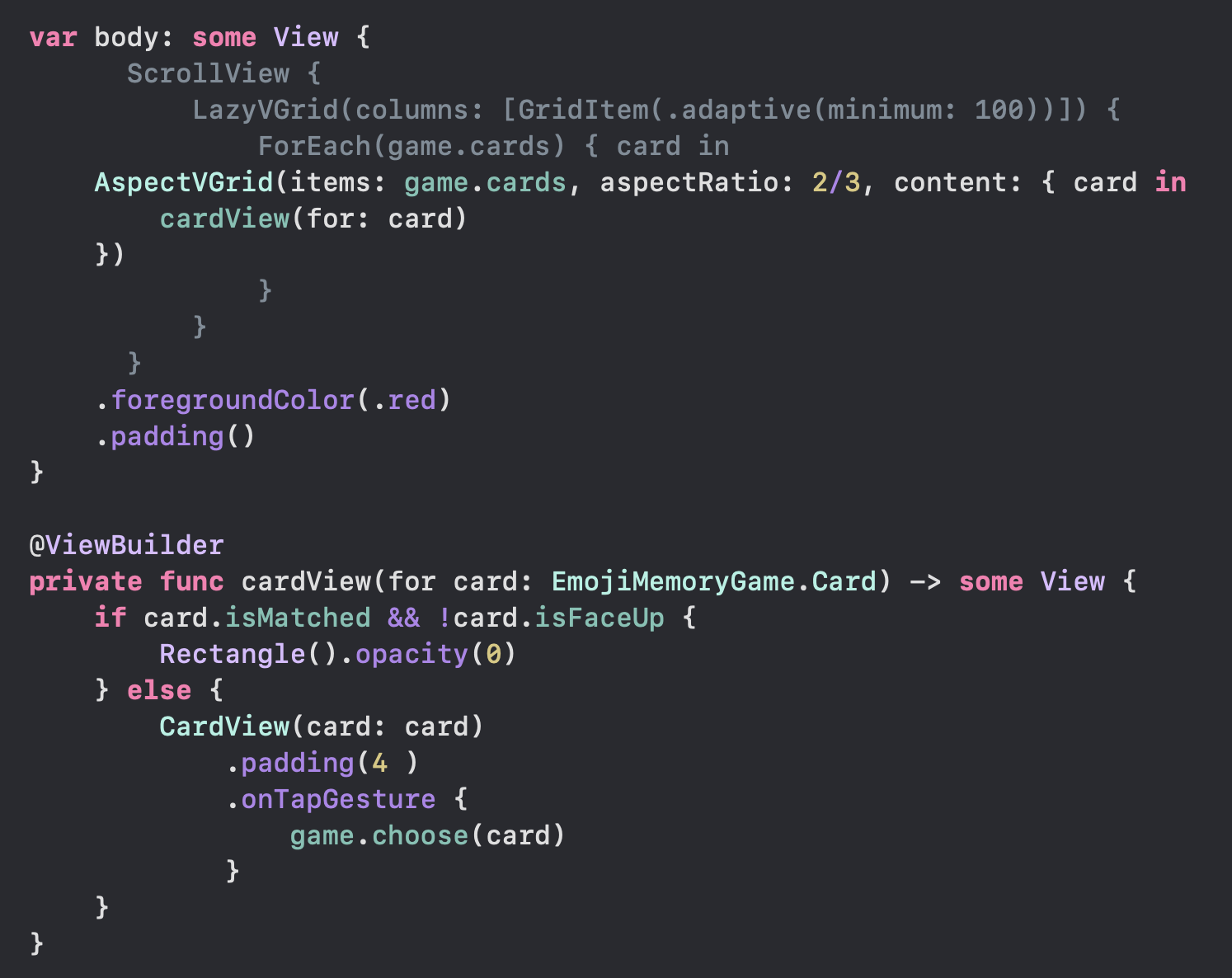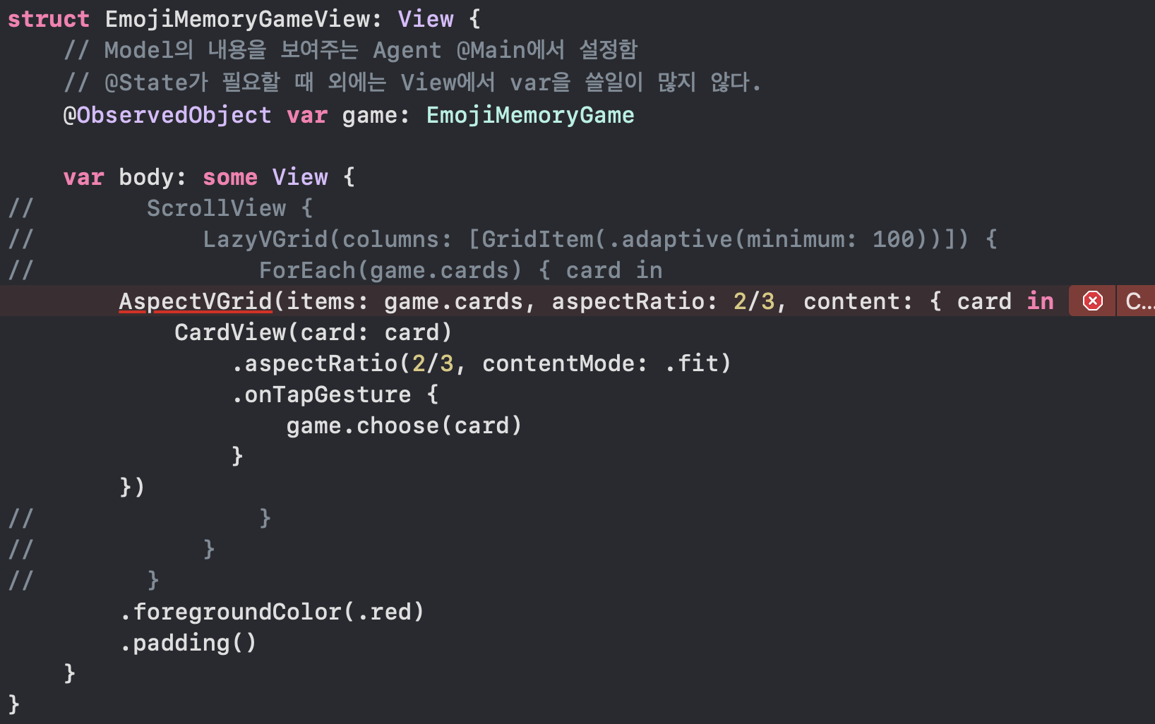 아래의 cardView 함수에서 @ViewBuilder 키워드를 빼버리면 함수 내부에 return 문도 존재하지 않으며 컴파일러가 View 처럼 생각하지 않기 때문에 무수한 오류가 나를 반겨준다.... 다시말해 함수 내부에 구현된 내용을 Viewbuilder 로 이해하도록 컴파일러에게 설명하여 별도의 오류가 생기지 않도록 만들어주는 역할을 한다. 하지만 paul hegarty 교수는 후자와 같은 방법을 선호하지 않는다고 한다.