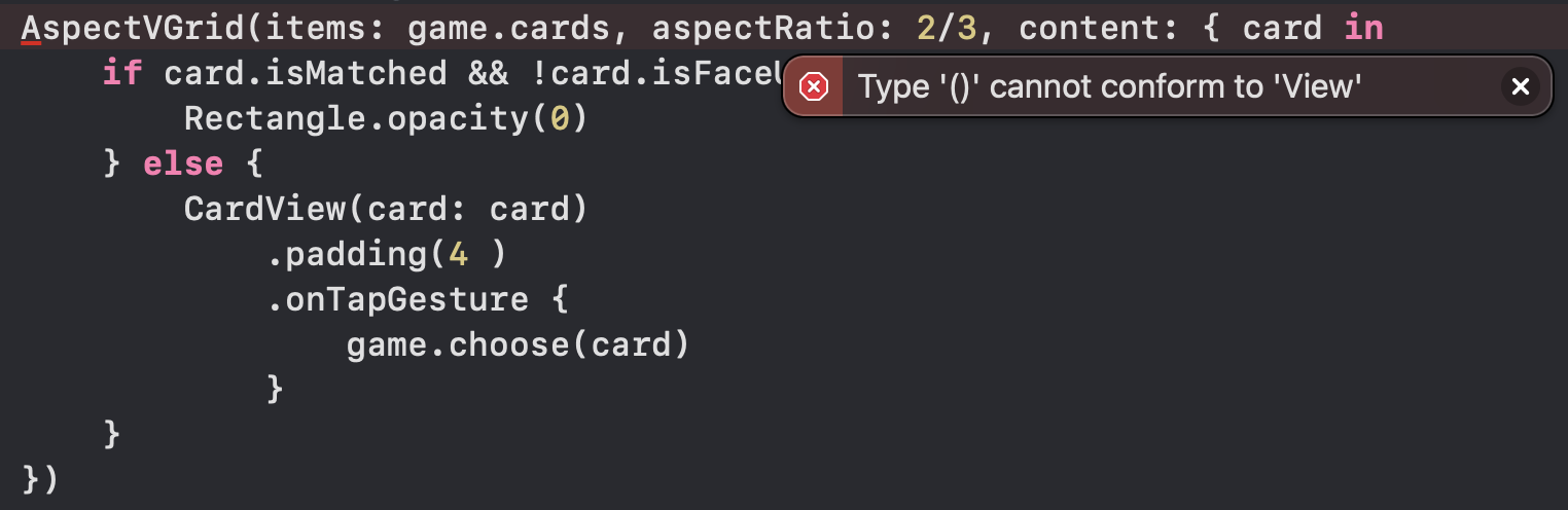 이전에는 CardView 하나만 AspectVGrid의 content로 들어갔지만 위와 같이 복잡한 조건문이 들어가자 바로 오류를 출력하고 있다. 사유는 content 파라미터에 들어가있는 코드가 ViewBuilder 함수가 아니기 때문이다. 어떻게 내부에 들어간 함수가 ViewBuilder로 해석될 수 있도록 처리할 수 있을까?