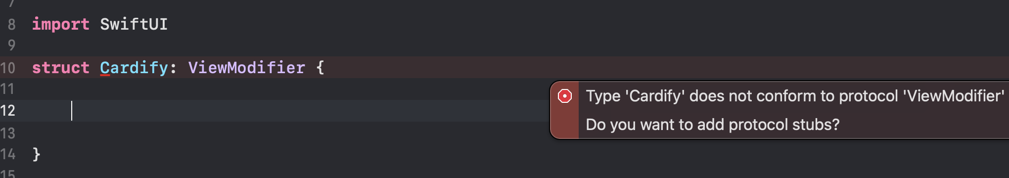 다른 프로토콜을 conform 시킬 때에도 비슷한 오류가 발생했듯이 이번에도 ViewModifier이 요구하는 메서드 혹은 변수를 구현해줄 것을 요구하는 Xcode 경고창이 뜨고 있다.