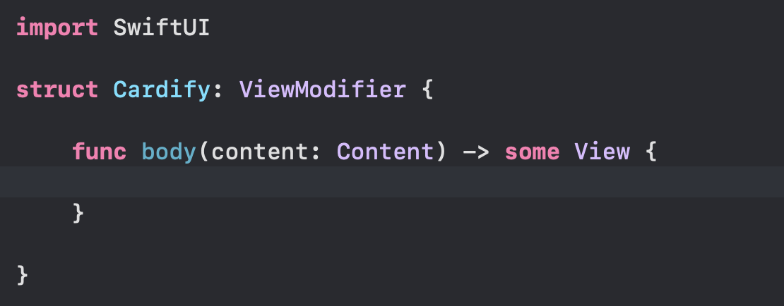 func body의 구현에는 View 프로토콜을 준수하기 위한 var body 구현과 마찬가지로 UI Building을 위한 코드가 포함된다. 우리의 목표는 body 부분에 카드 모양의 UI를 만들어주는 코드가 들어가는 것이기 때문에 이전에 작성한 CardView struct를 참조하여 modifier를 구현해보도록 하자!