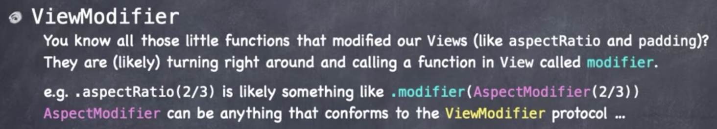 우리는 이미 ViewModifier를 사용해본 경험이 있다. 예를들어 aspectRatio, padding, foregroundColor, font와 같은 것들이 해당된다. 이들은 모두 View에 있는 modifier라는 함수를 호출한다.