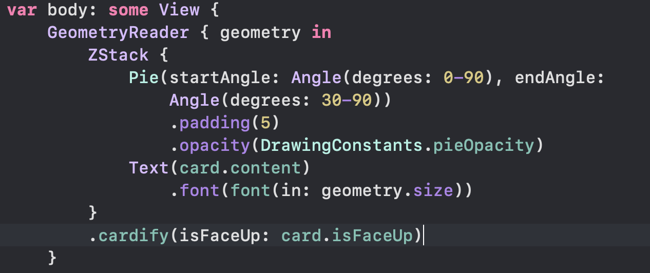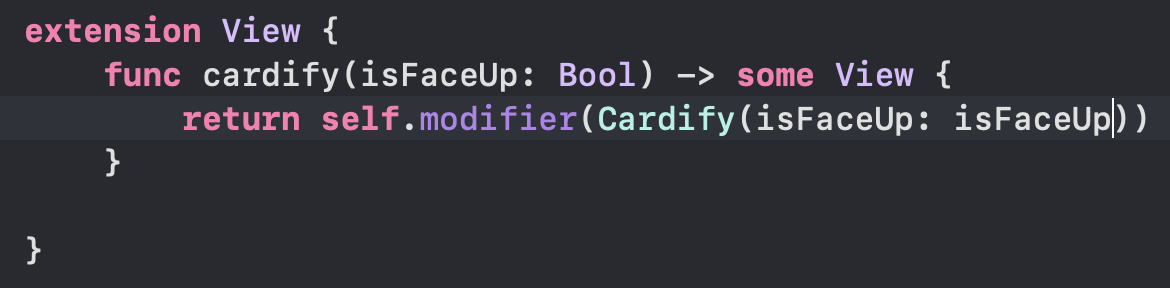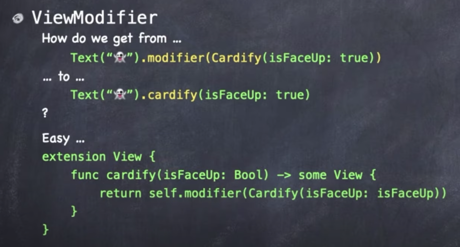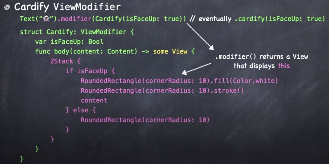 해답은 예시를 통해 배우는게 가장 좋은 방법이다. 예를들어 다른 View를 "card-ify" 해주는 ViewModifier를 만들고 싶다고 가정해보자! "card-ify"하다는 의미는 Memorize 게임에서 처럼 다른 View를 가져와서 카드로 넣어주는 기능을 담당한다. cardify를 구현하는 수정자는 어떻게 생겼을까?