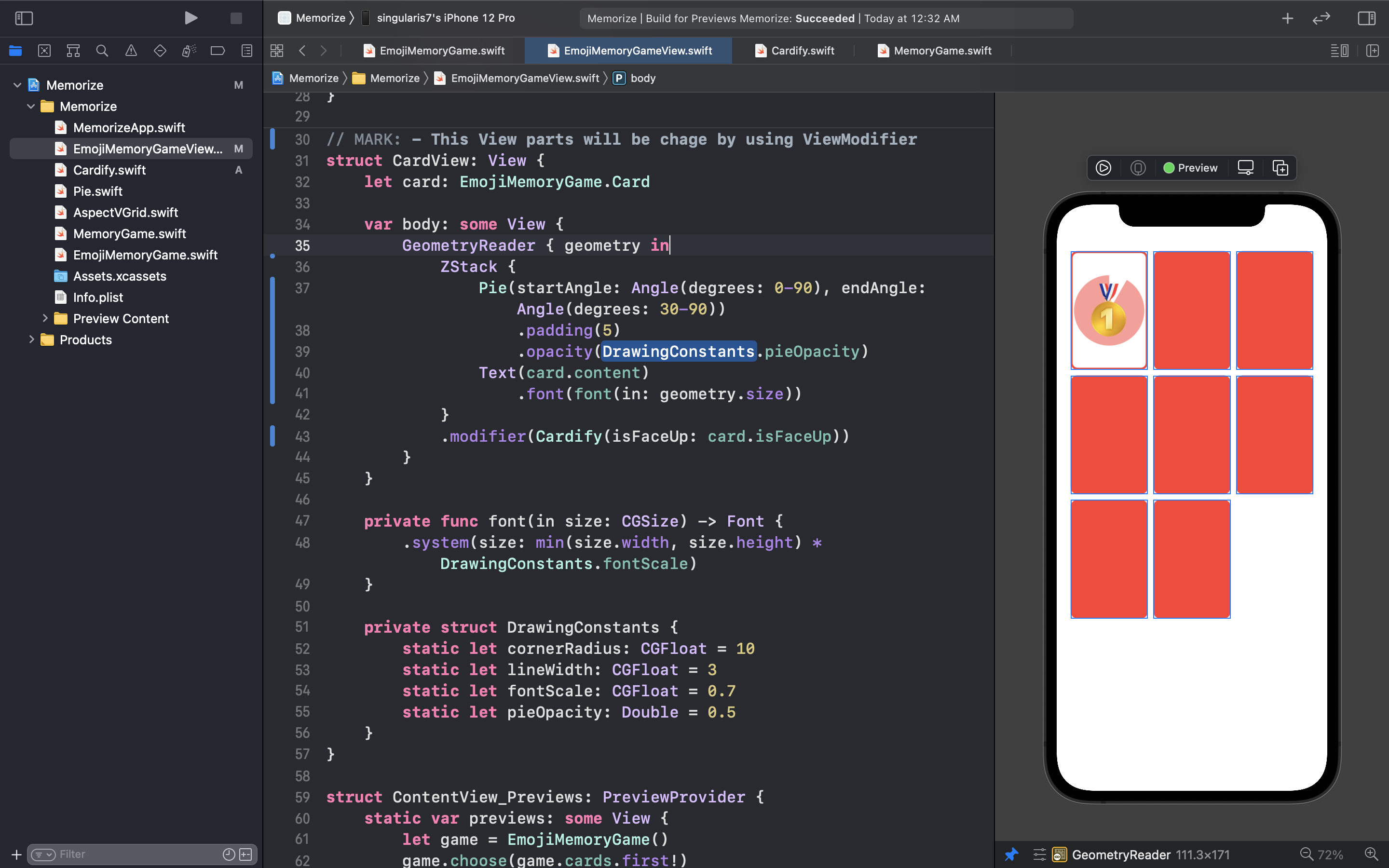 이전 코드와 비교해보면 cardify의 contentfh 어느 코드가 들어가야 할지 한눈에 찾아볼 수 있다! 두줄의 코드를 ZStack Combiner를 통해 결합하여 content로 넣어주면 문제가 손쉽게 해결될 수 있을 것이다.