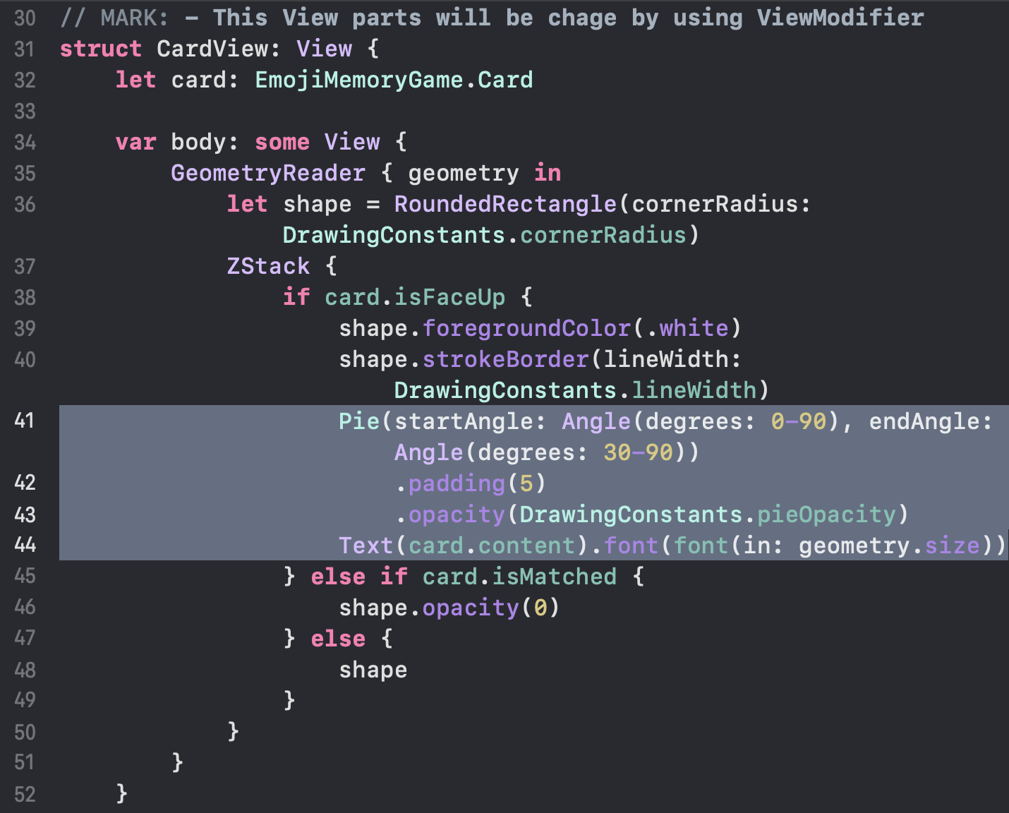 새로 정의하고자 하는 ViewModifier는 old view 하나를 가져와서 card에다가 담아주는 기능을 구현하며 기존에 정의해 둔 어느 다른 카드와 마찬가지로 카드의 정면이 보일 때에는 old View 내용이 카드에 담겨져서 보일 것이며 카드의 후면이 보일때에는 foregroundColor에 맞춰서 색이 변경되어 보일 것이다.