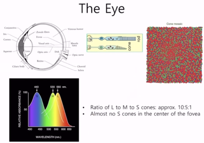 ์์ ๊ฒฝ์ Cone(๋นจ๊ฐ์, ์ด๋ก์, ํ๋์ ํ์ ), Rod(๋น์ ๋ฐ๊ณ ์ด๋์ด ์ ๋๋ฅผ ํ์ )๋ก ๊ตฌ์ฑ๋์ด์์ผ๋ฉฐ ์์ ๊ฒฝ์ผ๋ก ๋ค์ด์จ ์ ๋ณด๋ฅผ ํฉ์ณ์ ๋ชจ๋ ์์์ ๋ณด๊ฒ ๋๋ ๊ฒ์ด๋ค.