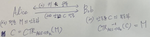 - bob์ด ์ํธ๋ฌธ c๋ฅผ ์ ์ก ๋ฐ์ผ๋ฉด ๋ณตํธํ ์๊ณ ๋ฆฌ์ฆ(CTR๋ชจ๋์ AES-128 inv)๋ฅผ ์ฌ์ฉํ์ฌ ๋ณตํธํ ํ๋ค.