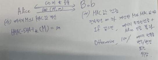 - Alice๋ ๋ฉ์์ง M์ ๋ํ์ฌ MAC๊ฐ m์ ๊ณ์ฐํ์ฌ ๋ฉ์์ง์ ํจ๊ป Bob์๊ฒ ์ ์กํ๋ค.