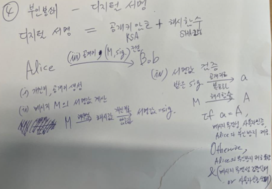๋ฉ์์ง๋ฅผ ์ ์กํ ์ฌ๋์ ์๋๋ฐ ๋ฐ์์ฌ๋์ด ์๊ฑฐ๋ ๋ฐ๋์ ๊ฒฝ์ฐ์ด๋ค. ๋์งํธ ์๋ช ์ผ๋ก ์๋ฐฉํ ์ ์๋ค. ๋์งํธ ์๋ช ์ ๊ณต๊ฐํค ์ํธ ๋ฐ ํด์ํจ์๋ก ๊ตฌํ๋๋ค. RSA์ํธ์ SHA-256 ์ํธ๋ฅผ ์ ๋ชฉ์์ผ์ ๋์งํธ ์๋ช ์ ๊ตฌํํ๋ค.