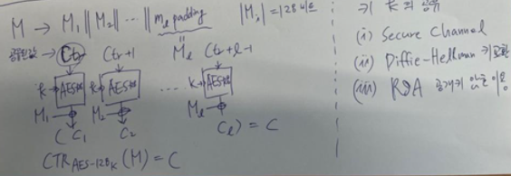 - ๋ธ๋ก๋ง๋ค 1์ฉ ์ฆ๊ฐํ๋ CTR ์นด์ดํฐ ๊ฐ์ ํค K์ ํจ๊ป ์ํธํํ ํ์ ํ๋ฌธ M๊ณผ XOR ์ทจํ๋ค.