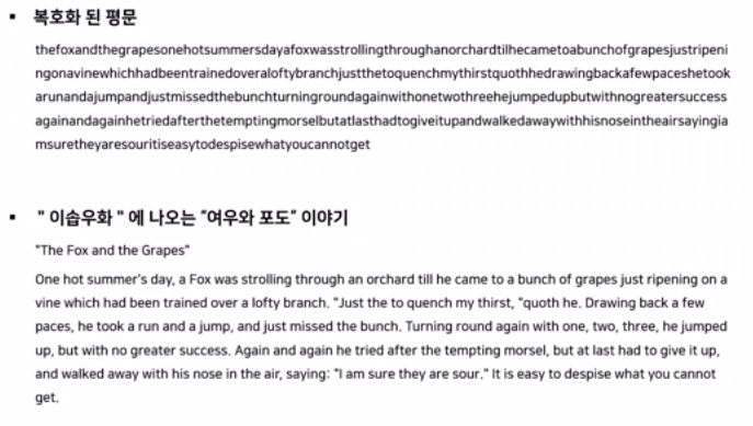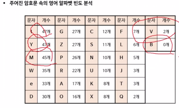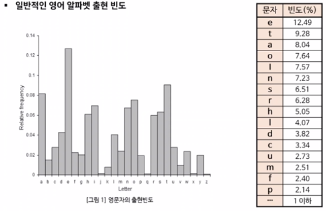 - ํ๋ฌธ์ ๋ฑ์ฅํ๋ ๋ฌธ์์ ๋น๋์ ์ํธ๋ฌธ์ ๋ฑ์ฅํ๋ ๋ฌธ์์ ๋น๋๋ฅผ ๋ค๋ฅด๊ฒ ๋ง๋๋ ์ํธ ์๊ณ ๋ฆฌ์ฆ