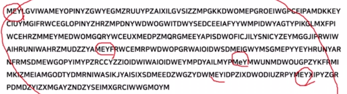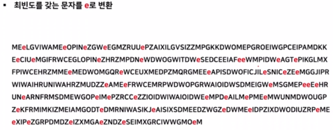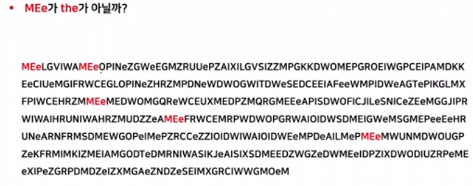 ๋ฌธ์์ด์ ์ ์ฌํ ์ดํด๋ณผ ๊ฒ์ด๋ค. ์๋ฅผ ๋ค์ด ๊ฐ์ฅ ๋ง์ด ์ฌ์ฉ๋๋ ๊ด์ฌ "the"๋ ํญ์ ๋์ผํ ์ํ๋ฒณ์ผ๋ก ๋ณํ๋์์ ๊ฒ์ด๋ค. ์์์ MEY๊ฐ ๋ฐ๋ณต๋๋ ๊ฒ์ ๋ฏธ๋ฃจ์ด ๋ณด์ "the" ์ผ ๊ฐ๋ฅ์ฑ์ด ์๋ค.