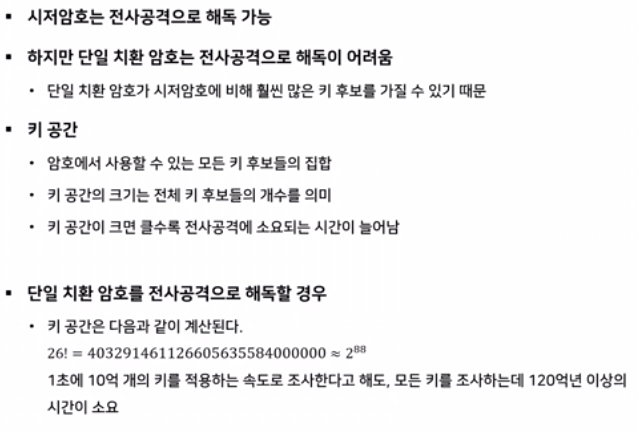 ์์ ์ํธ๋ ํค๊ณต๊ฐ์ด ์์์ brute-force ๊ณต๊ฒฉ์ด ๊ฐ๋ฅํ๋ค. ํค ๊ณต๊ฐ์ ์ํธ์์ ์ฌ์ฉํ ์ ์๋ ๋ชจ๋ ํค ํ๋ณด๋ค์ ์งํฉ์ด๋ฉฐ ์ ์ฒด ํค ํ๋ณด๋ค์ ๊ฐ์๋ฅผ ํค ๊ณต๊ฐ์ ํฌ๊ธฐ๋ผ๊ณ ๋ถ๋ฅด๋ฉฐ ํค๊ณต๊ฐ์ ํฌ๊ธฐ๊ฐ ํด ์๋ก ์ ์ฌ ๊ณต๊ฒฉ์ ์์๋๋ ์๊ฐ์ด ๋์ด๋๋ค. ๋ฐ๋ผ์ ๋จ์ผ์นํ์ํธ๋ ํค๊ณต๊ฐ์ ํฌ๊ธฐ(26!)๊ฐ ํฌ๊ธฐ ๋๋ฌธ์ brute-force๋ก ๋ซ๊ธฐ ์ด๋ ต๋ค.