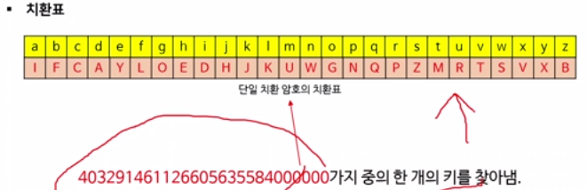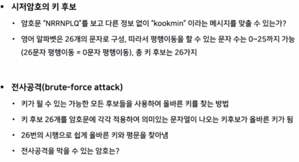 ๋ง์ฝ ๋ฉ์์ง๊ฐ ์์ ์ํธ๋ฅผ ํตํด ์ํธํ ๋์๋ค๋ ์ ๋ณด๋ฅผ ๋์ฒญ์๊ฐ ์์๋ค๋ฉด ์์ด ์ํ๋ฒณ์ ์ด 26๊ฐ์ด๊ธฐ ๋๋ฌธ์ ์ฝ๊ฒ ๋ชจ๋ ํค ํ๋ณด๋ฅผ ๋์ ํ์ฌ ํ๋ฌธ์ ๋์ถํ ์ ์๋ค. => ์ ์ฌ ๊ณต๊ฒฉ (brute-force attack)