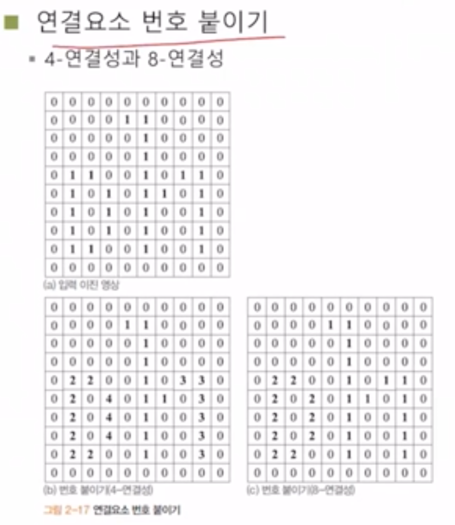 μμ κ°μ΄ μ°κ²°μμ λ²νΈ λΆμ΄κΈ°λ image labeling μΌλ‘ μ°κ΅¬λκ³ μλ€. 첫λ²μ§Έ μ΄λ―Έμ§μμ 1μ΄ μλ μ§μμ λͺκ°λ‘ λλ μ μλμ§ λΌλ²¨μ λΆμ¬λ³Ό μ μμ κ²μ΄λ©° 4 μ°κ²°μ±κ³Ό 8 μ°κ²°μ±μΌλ‘ κ³μ°ν΄ 보μμ λ μ½κ°μ μ°¨μ΄λ₯Ό 보μ΄κ³ μλ€.