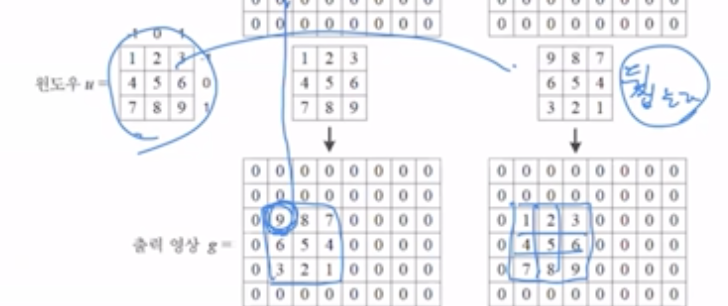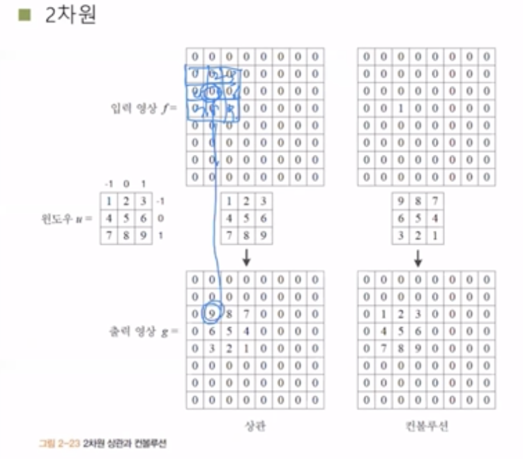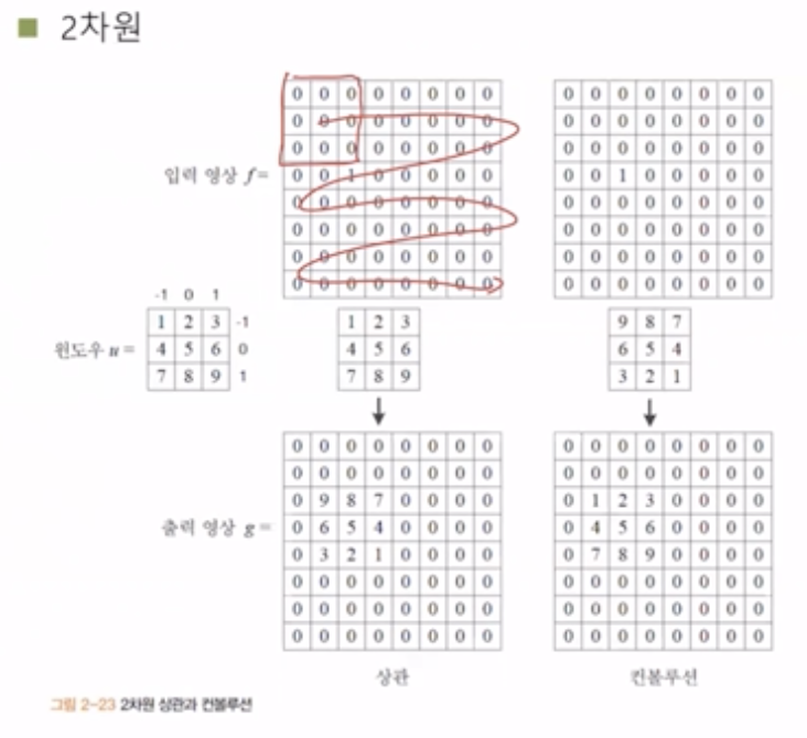 2μ°¨μ μμμμ 컨볼루μ κ³Ό μκ΄μ΄ μ΄λ»κ² μ΄λ£¨μ΄μ§λμ§ μ΄ν΄λ³΄μ. μλμ°λ₯Ό μμμ μμ λΆν° λκΉμ§ μμ§μ¬ κ°λ©΄μ μμ μ°μ°μ νκ² λλ€.