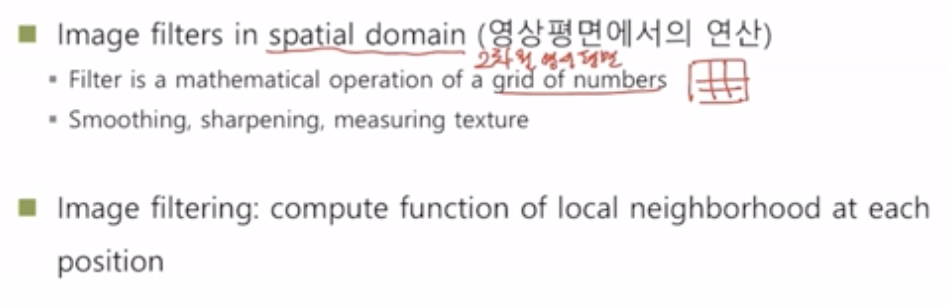 spatial domain (2μ°¨μ μμ νλ©΄)μμμ μ΄λ―Έμ§ νν°λ grid of numbersλΌλ νν°λ₯Ό μ€κ³νμ¬ μνμ μ°μ°μ ν΅ν΄ κ³μ°νλ κ²μ΄λ€. μμμ μ΄λ»κ² μ μ©νλκ°μ λ°λΌ smoothing, sharpening, measuring texture ν¨κ³Όλ₯Ό ꡬνν μ μλ€.