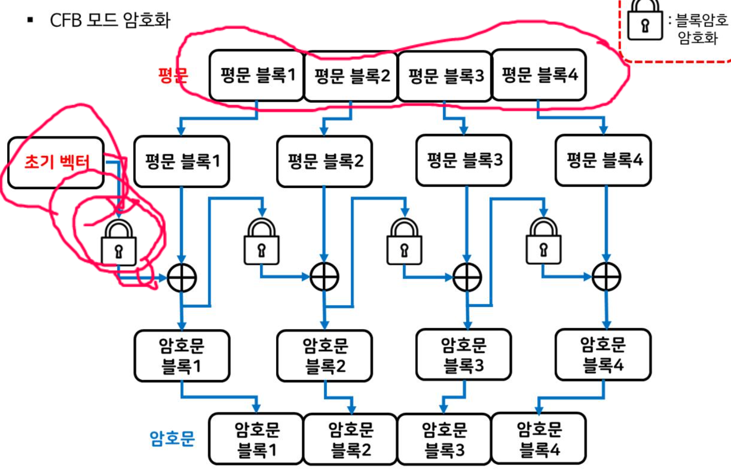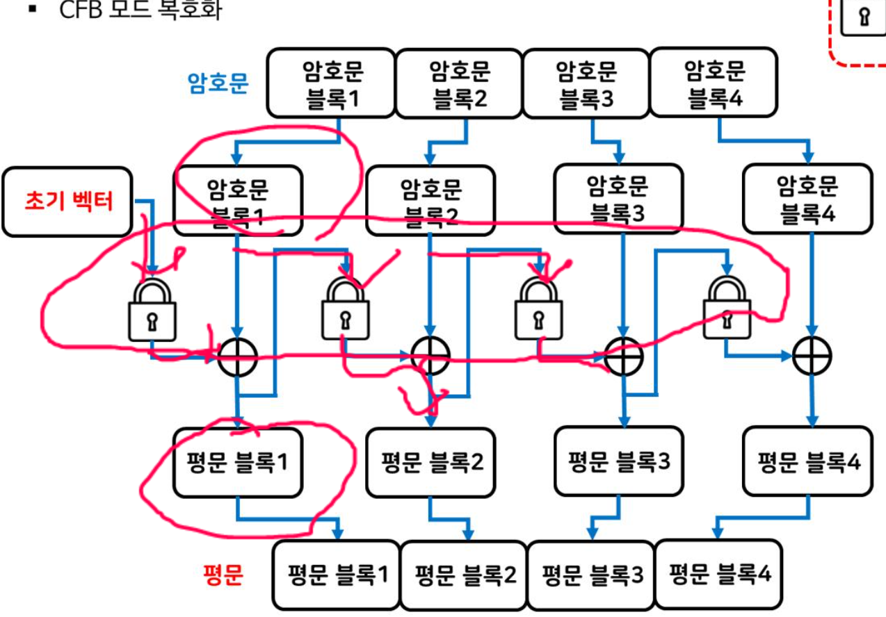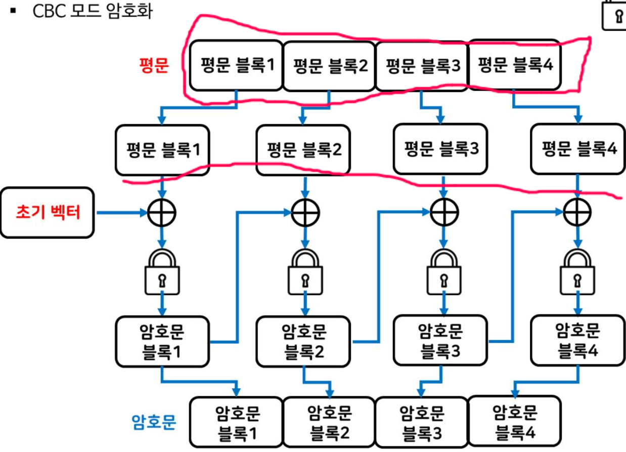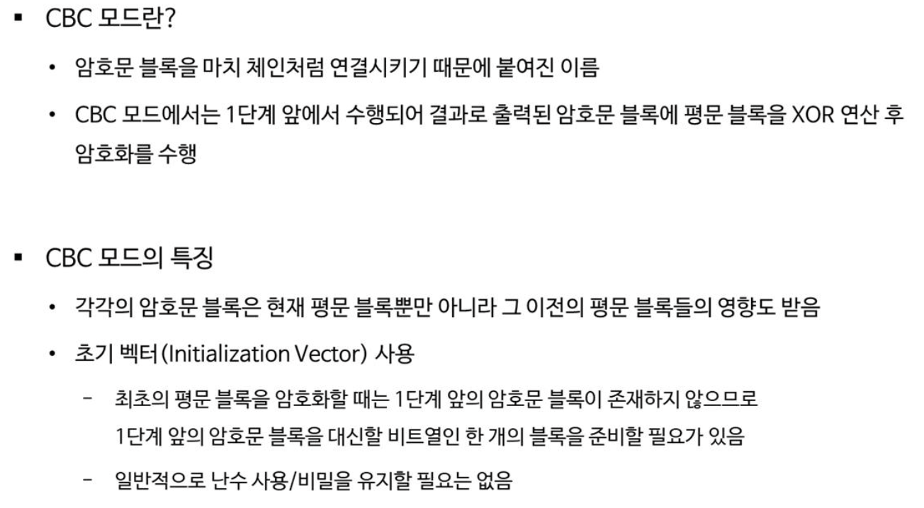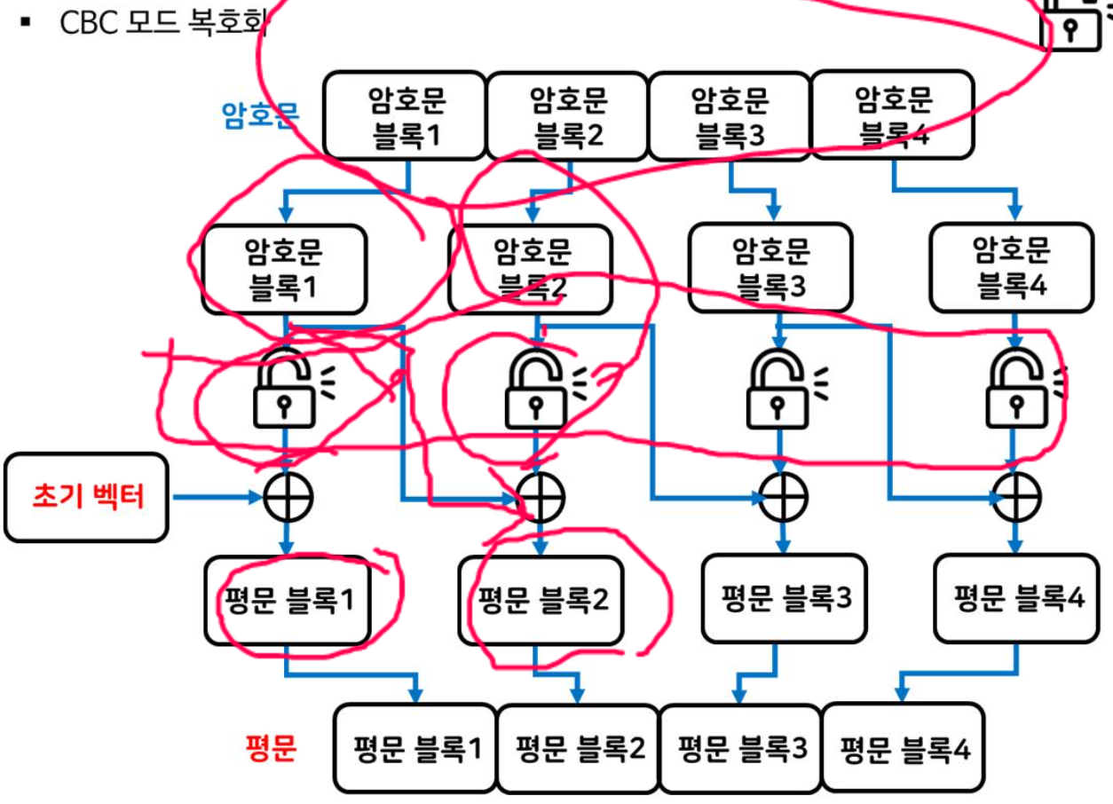 - ์ํธ๋ฌธ ๋ธ๋ก 1์ ํ๋ฌธ ๋ธ๋ก 1๊ณผ ์ด๊ธฐ๋ฒกํฐ๋ฅผ XOR ์ฐ์ฐํ์ฌ ์์ฑ๋๋ค.