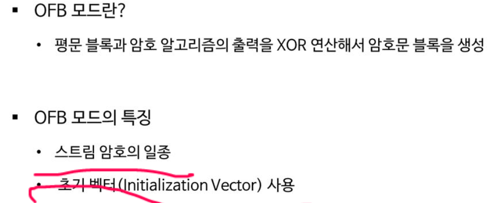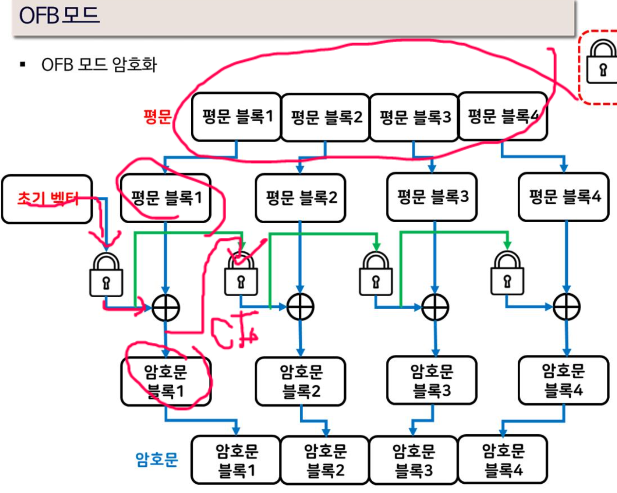OFB ๋ชจ๋๋ Output Feedback ๋ชจ๋์ด๋ค. ์คํธ๋ฆผ ์ํธ ๋ฐฉ์์ด๊ณ ์ด๊ธฐ ๋ฒกํฐ๋ฅผ ์ฌ์ฉํ๋ค.