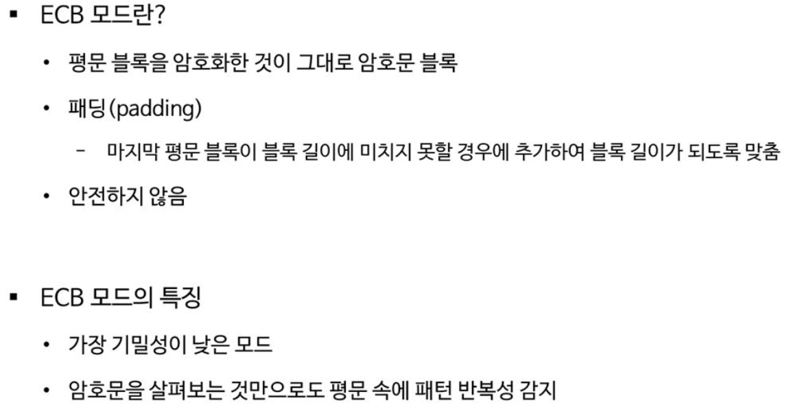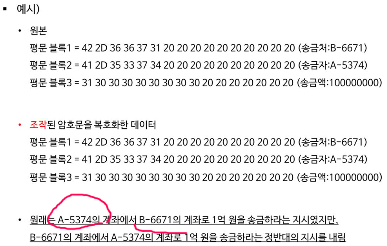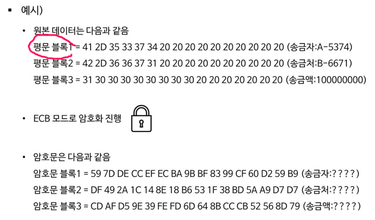 ๋ธ๋ก์ ๋ฐ๊ฟ์น๊ธฐ ํ๋ ๋ฐฉ๋ฒ์ผ๋ก ์์ ์๋ ์ ํ ๋ค๋ฅธ ๋ด์ฉ์ ๋ณด๊ฒ ๋์๋ค. ๋ธ๋ก์ ๋ฐ๊ฟ์ผ๋ก์จ ๋ด์ฉ๋ฌผ์ ํฐ ๋ณํ๋ฅผ ์ค ์ ์๋ ECB ๋ชจ๋์ ์ทจ์ฝ์ ์ด ์กด์ฌํ๋ค๋ ์ ๊ธฐ์ตํด๋์.